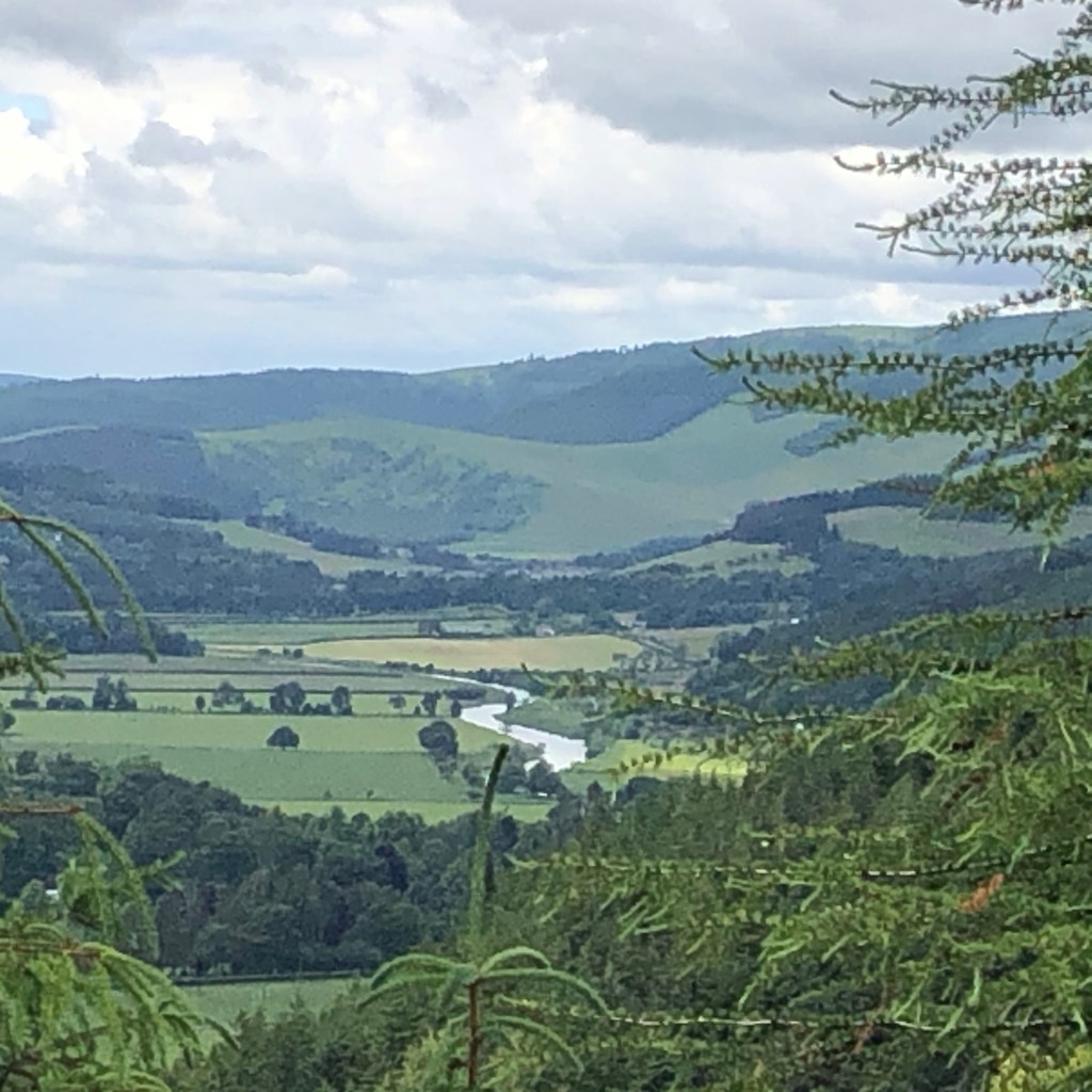 My day was spent almost wholly on the Southern Upland Way, also known, evocatively, at least in part, as the ‘Cross Borders Drove Road’. Today’s walk is within my ‘top half dozen’ LETJOG days in terms of ascent, with around 1,000 metres of climbing. Beginning with a long rise over rich pastures ringing to the cacophony of hundreds of bleating sheep, the path then descended equally steeply to Yair Bridge over the Tweed. Then came the big climb, up alongside a small tributary and through deep forest onto the moorlands of heather. The first peak, Three Brethren (on account of its three cairn towers), was followed over the subsequent five miles of undulation by a number of rounded summits, peaking with Brown Knowe at a height of 523 metres. What views along the way, and I had all of this beauty pretty much to myself, with just a couple of runners and one small group of local walkers for brief company!