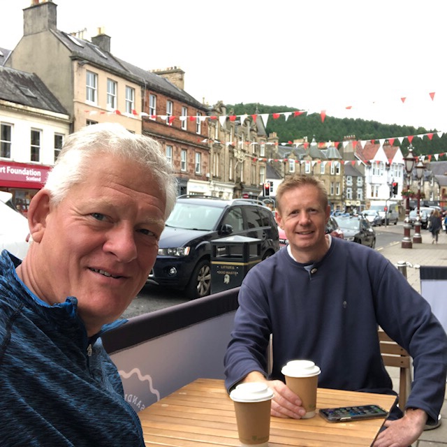What a pleasant surprise, to hear last night that I would be joined today by Fergus, my second cousin. Rachel and I had of course met for dinner with Fergus and his wife Susan last Saturday in Hexham, and, clearly caught up in the spirit of LETJOG, Fergus kindly made the trip up to Innerleithen this morning for an early start and a 20-mile hike!