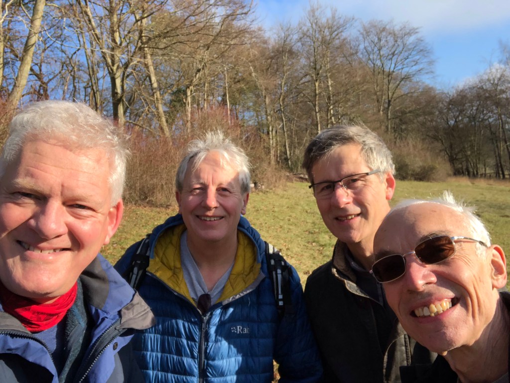 Last Friday’s walk, saw nine of us nordic walkers setting off pre-dawn from Ashridge, down the scarp into Aldbury village and out on a loop across the fields and golf course, as the sun appeared from behind the Chiltern scarpI couldn’t resist including this second image, if only for the quality of the light!Saturday dawned rather foggy, as a group of us, up early again with the poles, emerged from the woods onto the grazing fields along the Gade valleyAnd in the forest, this unusual coupling of conifer and deciduousI am told that the ‘slimline’ terracotta bricks built into the walls and columns of Great Gaddesden Church are of Roman origin, pilfered in medieval times from an earlier construction. Our return to our start point in Frithsden also referenced this ancient history of our environs, taking us past Roman Farm and along the sunken so-called Roman Road through the ridge from Nettleden.Continuing the Roman theme, Sunday saw Rachel and I a little further from home, walking along the Roman walls of St Albans in the City’s Verulamium Park (and those terracotta bricks once again) . . .. . . before heading off for a coffee at the Inn On The Park!Tuesday, too, started cold and bright, with the waters of the Grand Union Canal through Berkhamsted frozen over, and . . .. . . this wonderfully timeless experience was enhanced by the woodsmoke from the narrow-boats, hanging in the crisp morning airAnd finally, a longer walk today, with us four former Haresfoot Brewery colleagues trekking through the ice and mud for coffee and cake at The Alford Arms in Frithsden, and returning via the aptly-named Alpine Meadow!