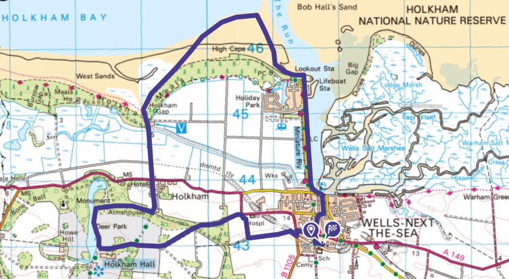 Back to the walking, and this week I have a super ramble to share with you all, from North Norfolk where I was lucky enough to be for a couple of days. I have been visiting the area now for nearly half a century, and I have walked down a great many roads and paths in the county over the years. I can’t think of any walk, mile for mile, that offers the diversity of landscape of this circuit around Holkham and Wells-next-the-Sea. Fields, forest, parkland, salt-marsh, pinewoods, dunes, expansive beaches, and a finish through the pleasant town of Wells, all combine for a most memorable experience, complemented in this instance by the ever-changing weather. I have included a map in case any of you are up this way and might want to re-trace my steps – it is at once a fairly flat route with a great many uplifting moments!