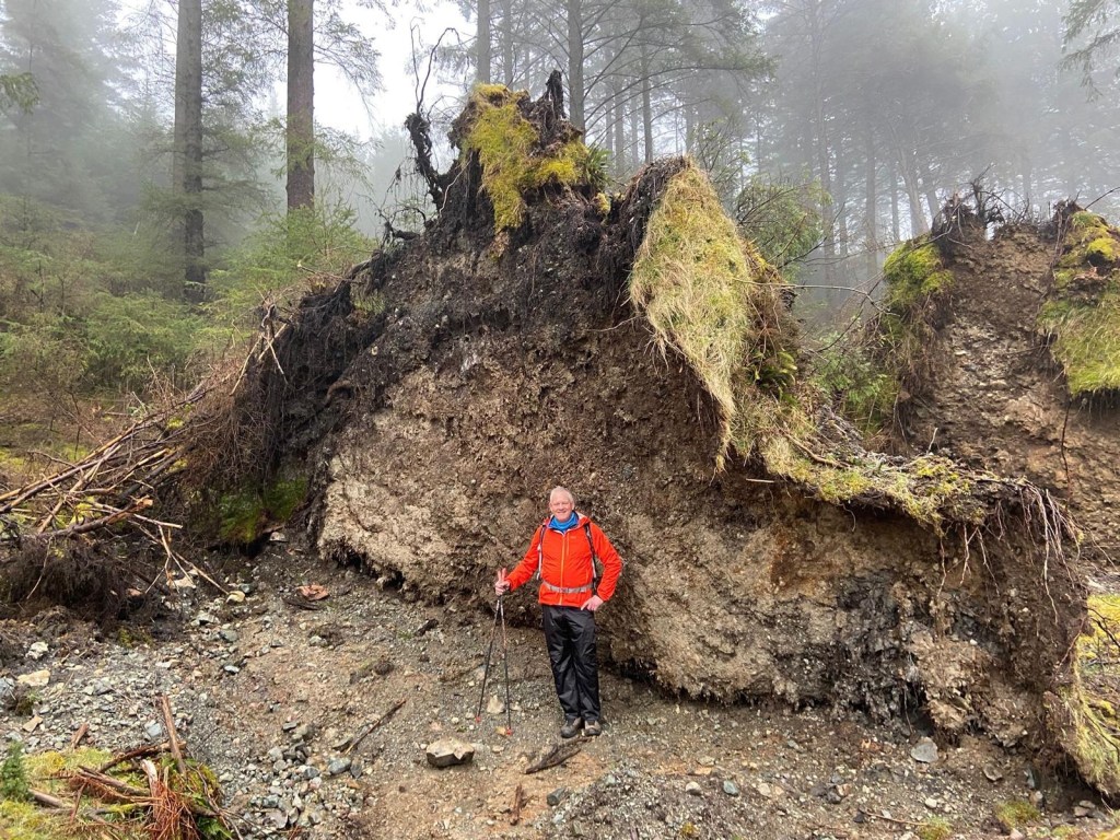 Presently our path entered the coniferous woodland on the north side of the River Liza, following a rather easier section along a vehicular track past Ennerdale Youth Hostel. Presently, on this stretch of the trail, we met Wendy, my nordic walking friend from home in Hertfordshire, and her black spaniel Maud, and they are to be our walking companions for the next few days! Together we followed the forestry track on to Black Sail Hostel, closed but nevertheless a landmark spot for a damp picnic lunch with another group of hikers.