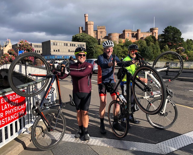 Then it was back in the camper-van for the drive into Inverness and to our overnight stop, The Blackfriars Hotel. In the bar Julian and I met up with another old schoolfriend, Rob, who has come up to join us for the finish of Ride & Stride and our ‘R&S Gala Dinner’ tonight. You may recall that Rob and I completed the Coast to Coast walk across northern England earlier in the year, and it is in his honour that the Ride & Stride team are raising funds for Parkinson’s UK. Together we walked the short distance to the bridge below the Castle in the centre of Inverness to see the cyclists home, after another 55 miles, for the completion of our Ride & Stride challenge around the NC500. What a huge achievement by Phil (King of the ascents), by James (King of the descents) and by Peter, whose level demeanour and good humour kept us all on the straight and narrow throughout our NC500 experience. Just brilliant guys, well done indeed!