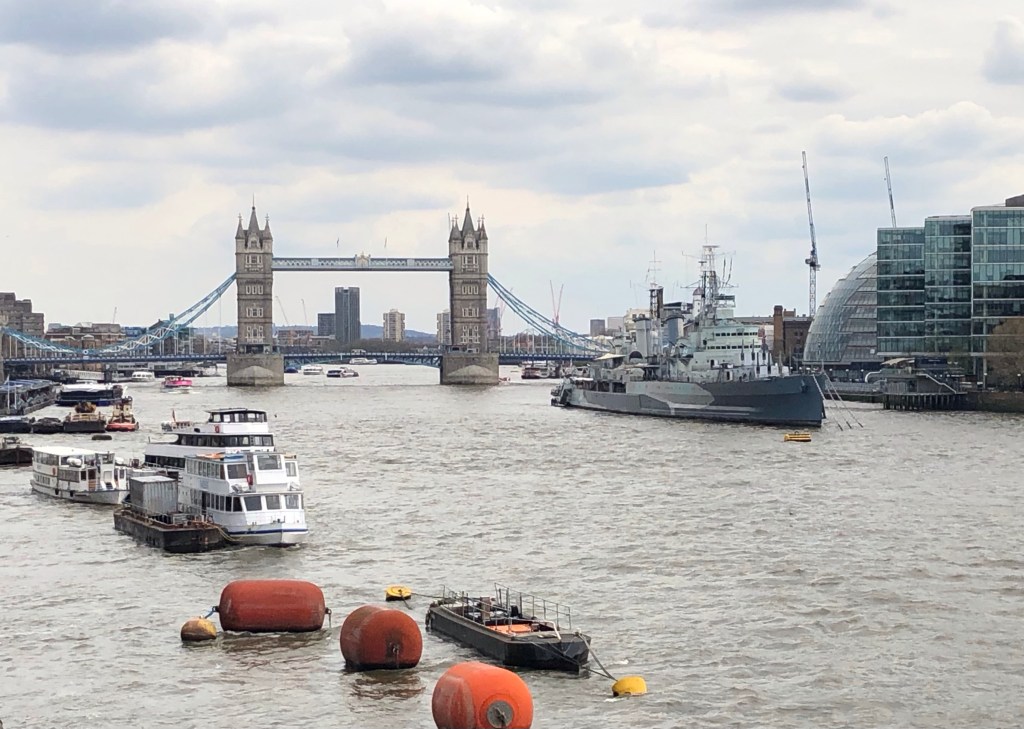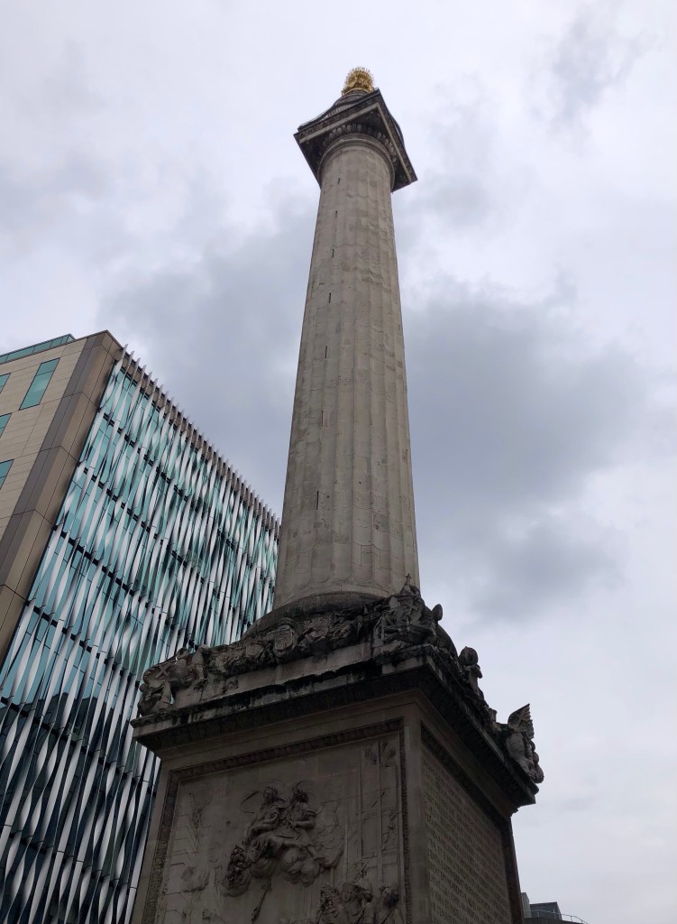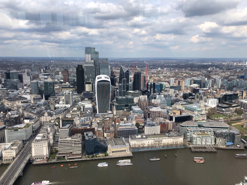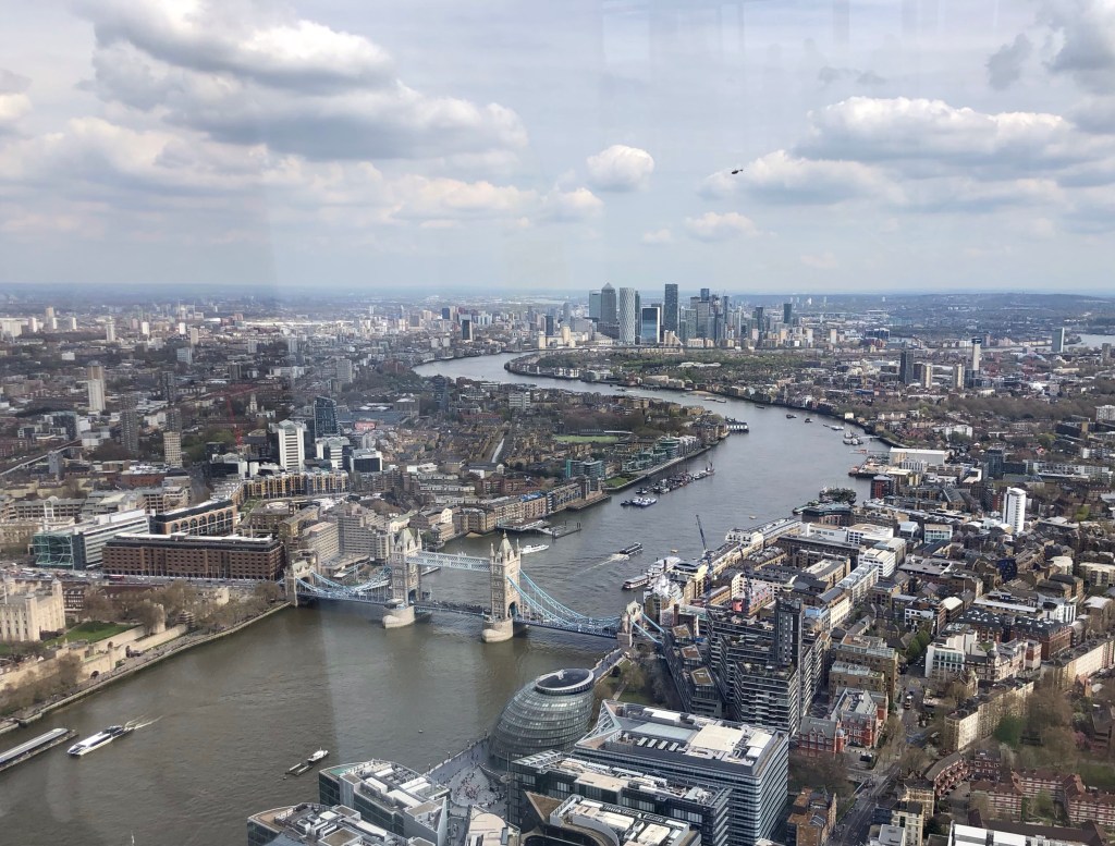Regent’s Canal – at this point just a stone’s throw from Euston Station – opened in 1816 to connect the Paddington Arm of the Grand Union Canal with the River Thames at Limehouse BasinShortly, just along the towpath, Coal Drops Yard, part of the new Kings Cross Central development, behind the railway terminusA floating bookshop!The entrance to the 886-metre Islington Tunnel, where the towpath stops (we concluded that the narrowboats must have been propelled along this section by the bargemen lying on their backs and ‘walking’ along the ceiling of the tunnel)Approaching Eagle Wharf Marina in Islington, where manufacturing, commerce, housing and leisure exist side-by-side along the water’s edgeThrough Shoreditch, via a pit-stop for brunch, our first views of the City (and of The Shard)In the City . . .. . . the modern structures of steel and glass dwarf the older stonework of the Square MileA little green space outside the Bank of England on Threadneedle StreetThe fluted Doric column of the Monument to the Great Fire of London (of September 1666) is sited near the northern end of London Bridge where the Church of St Margaret stood previously – the 62-metre structure, completed in 1677, was designed by Sir Christopher Wren and Robert HookeFrom London Bridge, looking down the River Thames to Tower Bridge and HMS BelfastThe London Shard, in Southwark on the South Bank, was designed by Renzo Piano and completed in 2012: at 310 metres high the 72-storey structure remains the UK’s tallest buildingA trip up ‘The View from The Shard’ on the 69th floor proved irresistible on such a clear day, for some wonderful views over the commercial heart of the City . . .. . . and down onto St Paul’s and the western part of the Square MileHaving been chosen originally by William I for the site of the White Tower in the 1080s as he sought to protect the gains of his conquest, The Tower of London was added to over successive centuries during the late Middle Ages,The vistas today extended for 50 miles in all directions, here eastward down the Thames past Tower Bridge and over Canary Wharf . . .. . . and (in the very far distance) south-eastwards towards Westerham Heights and Betsom’s Hill on the North Downs, County Tops that I ascended last monthTaking in the sights!Back on terra firma at the front of St Paul’s Cathedral: the building was designed by Sir Christopher Wren in the years following the Great Fire and was ‘topped out’ by his son Christopher Jnr in 1708 – Wren himself survived well into the 18th Century to see the completion of the works over the subsequent decadeWalking west over Holborn Viaduct we approached the summit as the road rises along High Holborn . . .. . . to the County Top at the City of London‘s boundary with Midtown just outside of Chancery Lane tube station – the red terracotta gable over Mark’s shoulder (and the similarly-coloured towers and facade in the preceding photo) are of Waterhouse’s fine gothic revival-style building, Holborn Bars, formerly the Prudential headquarters where I worked for two years in the mid-1980’s