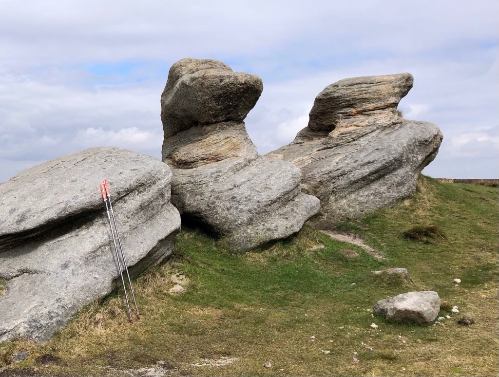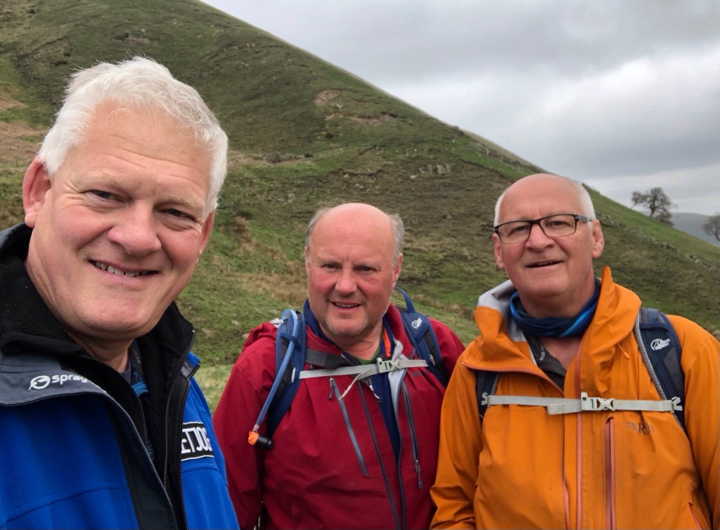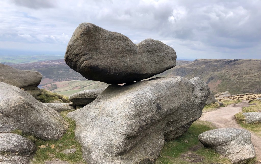 My start- and end-point todayThe 19th Century Trinity Church in Edale, built of local stone, blends well with this rocky landscapeOpposite the Nags Head pub, where the Pennine Way starts its 268-mile northward journey to Kirk Yetholm in ScotlandA chance meeting with Peter and David made for a colourful trio along the first few miles out of Edale: these two intrepid walkers have spent the last few weeks trekking up from Land’s End en route to John O’Groats via a not dissimilar path to the one that I followed almost two years ago – I admit to a degree of envy for the pleasures they have in store over the days and weeks to come!Even our bright colours failed to startle these henfolkHalfway up Jacob’s Ladder, built (according to some fellow ramblers) by a Victorian landowner of that name, either for altruistic or commercial purposes (they were unable to agree on this)At the top of the Ladder this cairn stands guardFurther up at Kinder Low this trig point on the Way marks 633 metres of elevation, just three metres short of the summit of Kinder Scout – hence requiring of me an onward traverse of the moorland plateau to reach my ultimate goal for the dayWind-sculpted gritstone rocks (with walking poles for scale) . . .. . . and a fine balancing act!The view from the top of Kinder Downfall, a 30-metre waterfall (when there is enough flow), where I had my picnic lunch overlooking Kinder Reservoir and the landscape to the westA really tricky half-hour crossing of the peat-bogs on the plateau took me eventually to . . .. . . this modest stake in the ground that marks the indistinct summit of the Kinder Scout plateau – at 636 metres above sea level this is the highest point in the Peak District, enjoying a prominence of 488 metresSome more tricky navigation across the peatlands . . .. . . to rejoin the main path, well-made here to counter the erosive consequences of many a pair of walking bootsPassing the buttress of Crowden Tower . . .. . . before a steep rocky descent down the gorge . . .. . . and eventually into the beautiful lower Grinds Brook valleyAt last, an easy path across grazing fieldsBack in Edale village, just in time for the hourly train