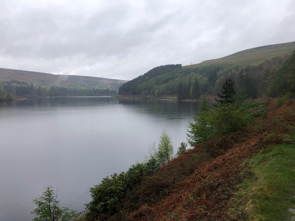 It had to happen sometime over the four days of my LETJOG Peaks escapade to the Peak District, as enjoying a totally dry walking week in this massif would be to miss an integral part of the experience. And so, with a timing exactly to forecast, the rain arrived this morning; repeated showers, light and heavy, as I made the trip up from Hathersage and along the Ladybower Reservoir to begin my day’s walk from the Fairholmes Visitor Centre. Even now luck was not completely against me, as the first few wet miles of my walk held the level lakeside path, enjoying some intermittent tree cover that sheltered me from the worst of the elements – and then the skies cleared just ahead of my climb to the moors.