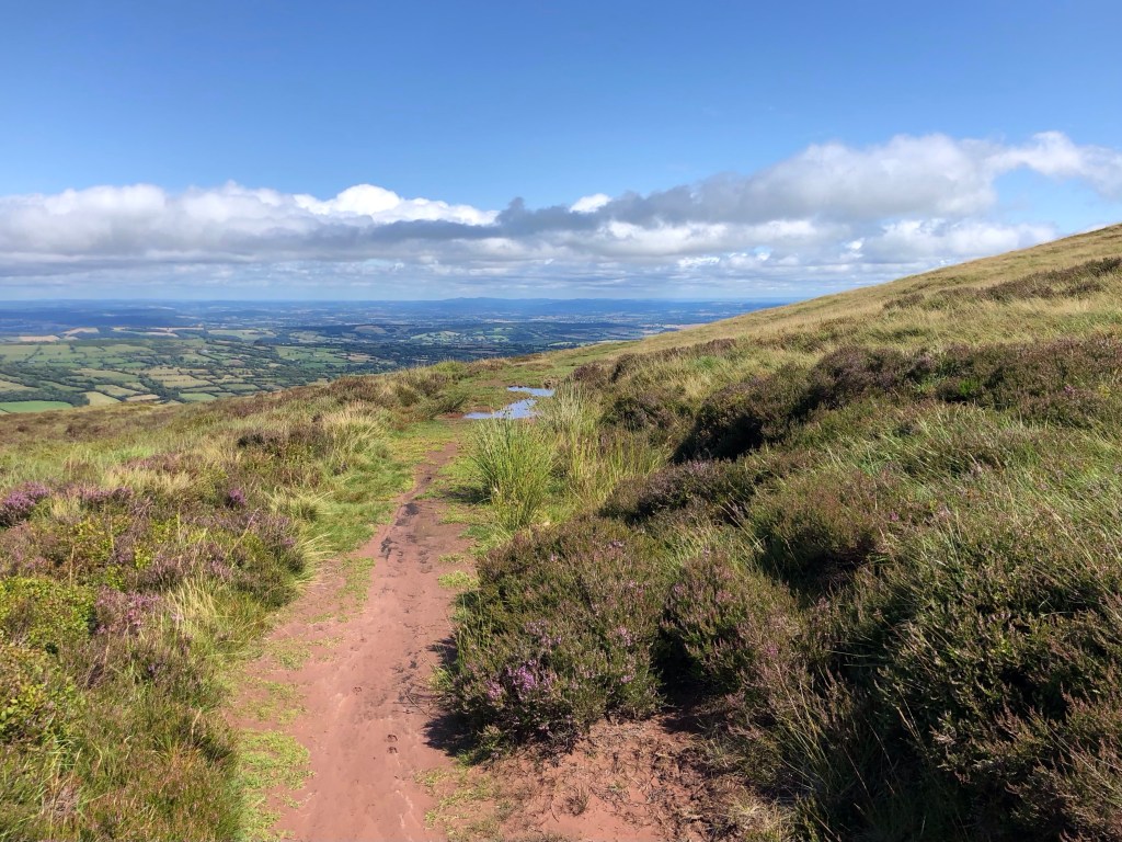 I was quite surprised when researching my LETJOG Peaks challenge to find that the apex of Herefordshire, Black Mountain at 703 metres above sea level, ranks fifth highest amongst all of the tops of the Ceremonial Counties of England. It is also the only pinnacle of any English shire to carry the suffix ‘Mountain’, lending the climb some further appeal perhaps. The summit itself lies on the border between England and Wales on the long ridge that runs north-north-westwards along the boundary of the principality, a little to the south of Hay-on-Wye. From this watershed, and for most of my walking day in the clear air, the views were stunning, extending from the Bristol Channel in the south, around through the eastern horizons to the Malvern and Shropshire Hills, and then, to the left of my path, westwards across the Brecon Beacons and on to the hills of mid-Wales and as far as Snowdonia in the distant haze. I hope that you enjoy the pictures!