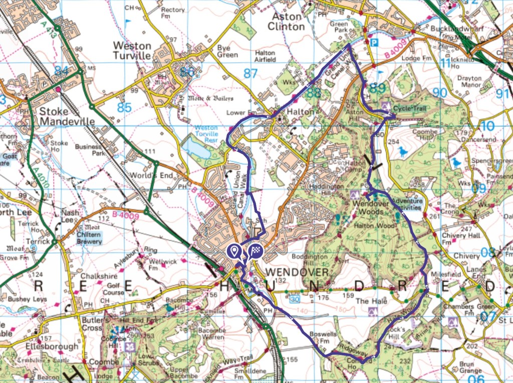 On the junction of Aylesbury Road, Tring Road and the High Street stands Wendover’s iconic Clock Tower: originally built as a single-storey market hall and gaol in 1842, the structure was extended upwards in 1870 to incorporate the clock that still remains in working order todayThe town’s central square is called The Manor Waste, and this was formerly an open area of common ground provided by the Lord of the Manor to accommodate agricultural fairs and weekly markets – the charter for the latter was bestowed on Wendover by King John in 1214: the space had its latest makeover in 2015 and the Thursday market continues to this dayThe ‘Twinning Stones’: Wendover is twinned with Liffré in the French region of BrittanyReady to go – the ‘Magnificent Seven’ setting off across the Wendover Brook, a small chalk stream notable for its clear waterStill within the town, Hampden Pond was enlarged in the late 18th Century to provide water to serve the Wendover Arm of the Grand Union Canal: unreliable flows led eventually to the abandonment of the pond and it was allowed to dry up for some decades, before being restored in more recent times as ‘a peaceful oasis where the needs of people and nature are balanced’Passing St Mary’s Church . . .. . . and joining the Ridgeway path out of the townLight at the end of the tunnel . . .. . . as our climb started, up Hogtrough LaneOver farmland, and our first view of Haddington Hill (right centre, in the far distance) . . .. . . and into Wendover Woods now, on a steeper pathWonderful Chiltern beeches, with leaves yet to turnThe final climb, along a sunken section of Grim’s Ditch (see my Blog ‘Green Green Grass’ of 17 March) . . .. . . and made it – the seven of us on the summit of Buckinghamshire: Haddington Hill in Wendover Woods, at 267 metres of elevation!Haddington Hill has a prominence of 180 metres, so qualifies as a rare South East England ‘Marilyn’, but being in a forest the views that it offers are very limited: however, after a welcome stop for coffee and cake at the top, we took a short diversion to the trig point on Aston Hill, a few metres lower than the peak but with more open vistas . . .. . . that improved further, northwards over Aylesbury Vale, as we continued on our path down the slopeTesting topography on the Chiltern Forest Golf Club fairways . . .. . . before we completed our descent to the canal through Cobblers Pits, an area of woodland on the lower slopes that is managed to promote ecological diversityThe Wendover Arm of the Grand Union Canal opened in 1799 having been commissioned to capture water off the Chiltern Hills, primarily to feed the main canal at Marsworth where the two waterways meet, close to the Tring Summit level – but despite the later installation of reservoirs and pumping stations the water supply from the Arm proved unreliable and the canal was finally closed to navigation in 1904 (although there is a current project to restore and to re-open this seven-mile stretch of waterway)A haven for ducks . . .. . . and for an angry swan, who resisted my intrusionRounding a bend in the canal, near Halton . . .. . . before we crossed into the fields at Oliver’s BridgeBack into Wendover, at the very end of the Wendover Arm