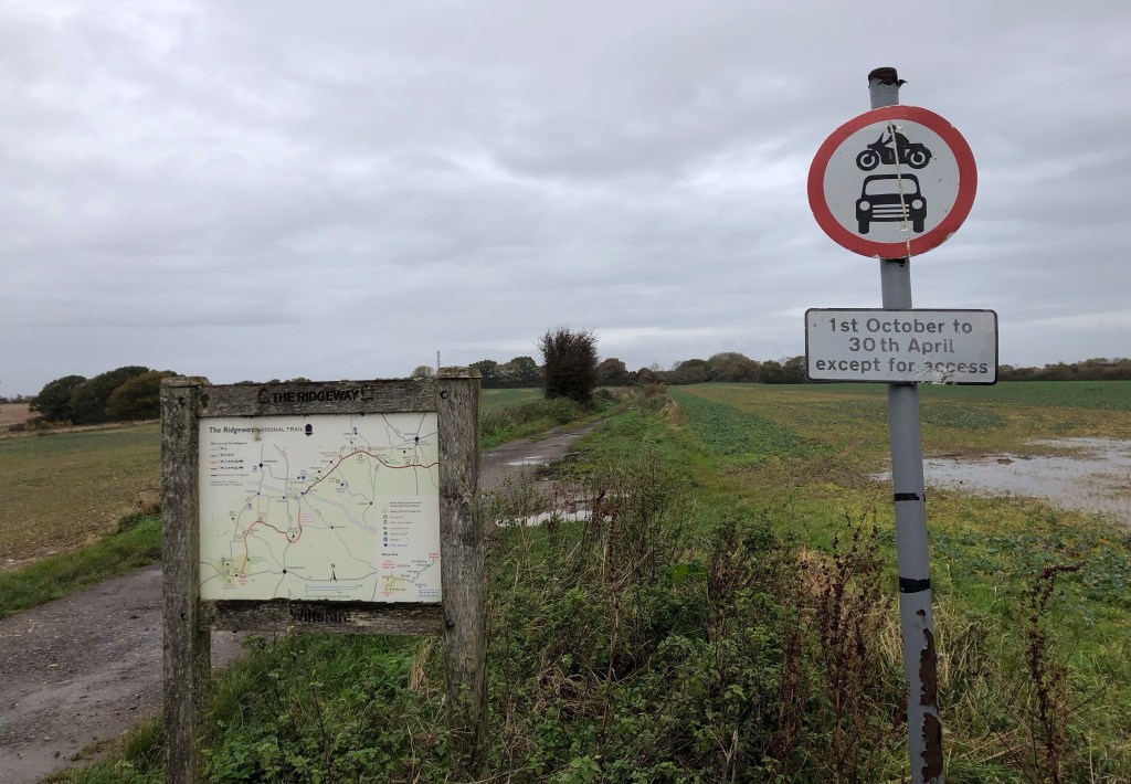 * Distances: just as a footnote, the mileages stated in my headings are my total ‘boots on’ walking distances for the day; they exclude morning and evening wanders but include the sections of my trek required to get to the start of my daily Ridgeway walk, and in getting from the trail to my evening destination. So, for example, today’s 19.8 miles comprises 18.3 ‘Ridgeway miles’ (according to my OS map plots) and the 1.5 miles into Wallingford in getting me from the Ridgeway path. It is likely that my actual distance walked slightly exceeds these figures, on account of short diversions to look at various ‘wayside wonders’ and for taking photos, etc – as well as in the evasion of the many deep puddles and boggy areas!