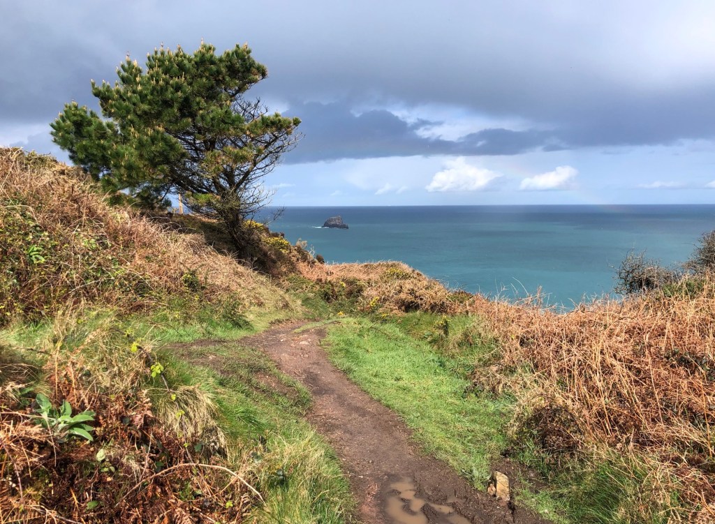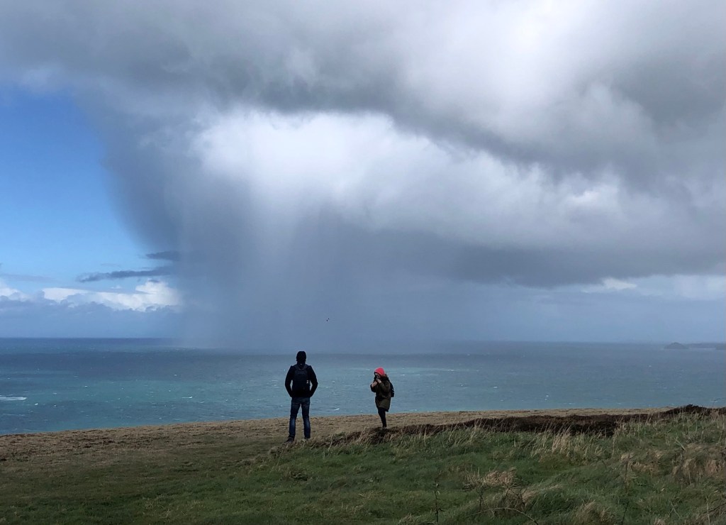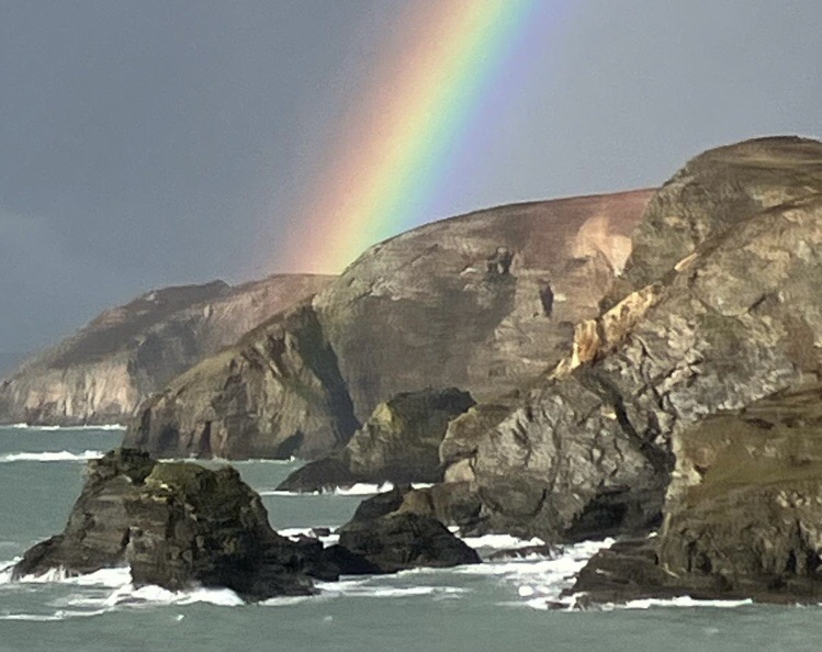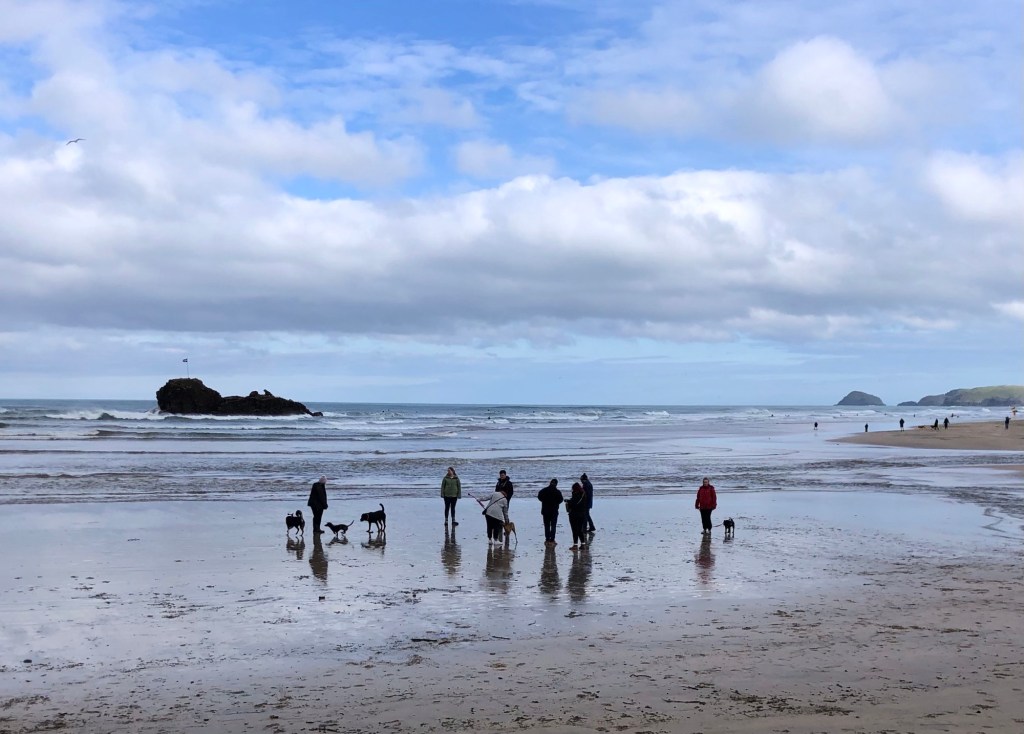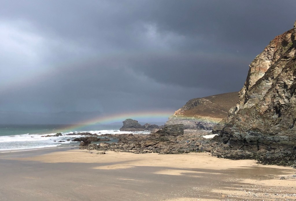 Squally showers out at seaRachel captured this downpour – from which we received a short but intense glancing blowWithin minutes calm was restored, and we even enjoyed some sunshine on the Coast Path past Newdowns Head . . .. . . and then a rainbow over the rocks of Cow and Calf . . .. . . that persisted as we approached the Coastguard Hut at St Agnes HeadGorse in bloom alongside the pathSome fine sea views westward along the cliffs of the peninsula . . .. . . that became further-reaching as we climbed to the top of St Agnes Beacon, at 192 metres of elevation: an inscription on the plaque reads ‘Legend has it that Giant Bolster could stand with one foot on St Agnes Beacon and the other on Carn Brea – Giant Bolster’s wife was made to clear the neighbouring fields of stones, and three aprons full are seen today as barrows (burial mounds) on top of the Beacon’Looking eastwards now, over St Agnes as far as the rocks off Penhale Point and beyondBack down into Trevaunance Cove we met with another shower and another rainbowSome big waves, as the tide came inNext morning, Easter Day, the climb up the cliffs eastwards from ‘our’ bayMine workings at Trevellas Porth . . .. . . and some early bluebells in the valleyFollowing the Coast Path, with views over Cligga Head . . .. . . then rounding the headland towards PerranporthEaster Sunday morning on Perranporth’s extensive sands . . .. . . with the flag of St Piran flying on the rocks In Trevaunance Cove this afternoon the Easter Sunday Dog Races attracted quite a crowd!