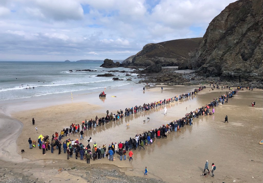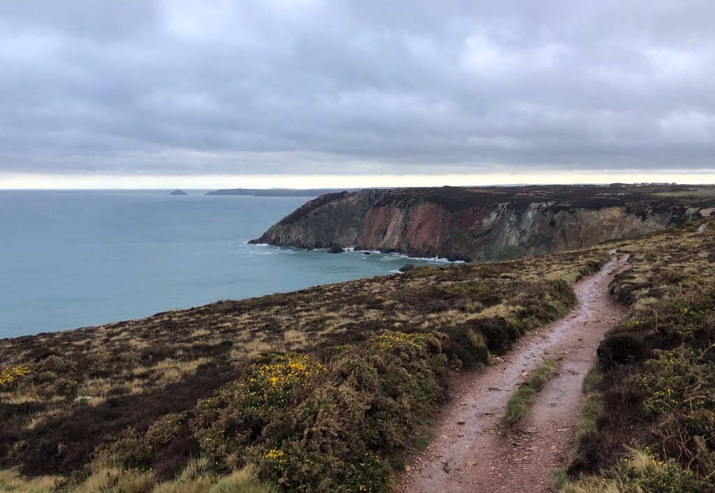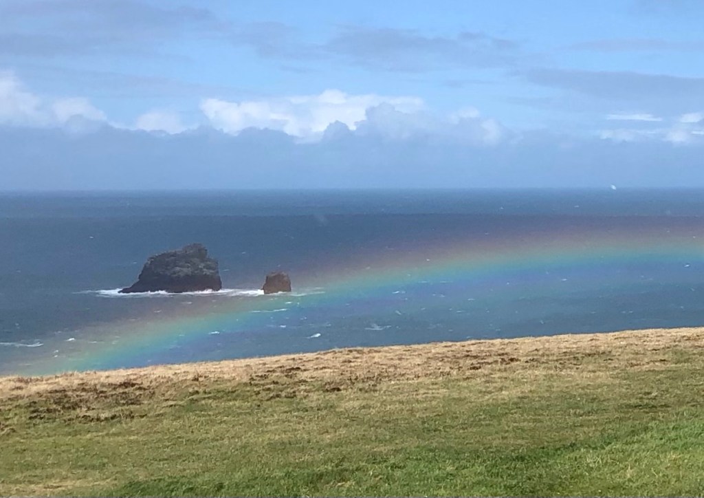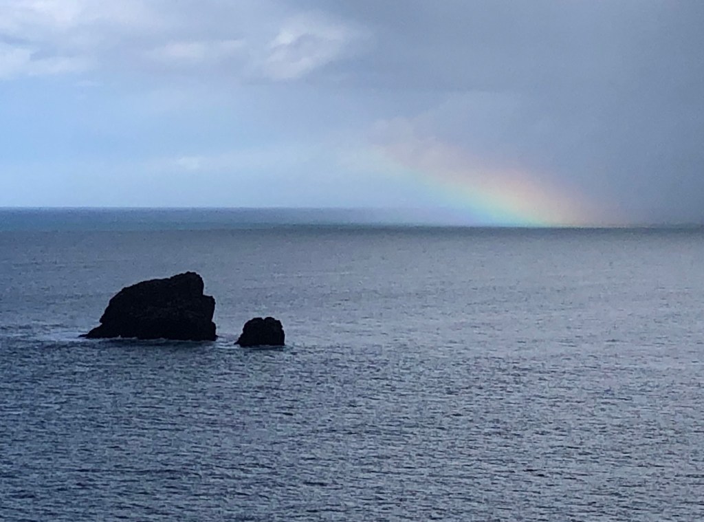 Squally showers out at seaRachel captured this downpour – from which we received a short but intense glancing blowWithin minutes calm was restored, and we even enjoyed some sunshine on the Coast Path past Newdowns Head . . .. . . and then a rainbow over the rocks of Cow and Calf . . .. . . that persisted as we approached the Coastguard Hut at St Agnes HeadGorse in bloom alongside the pathSome fine sea views westward along the cliffs of the peninsula . . .. . . that became further-reaching as we climbed to the top of St Agnes Beacon, at 192 metres of elevation: an inscription on the plaque reads ‘Legend has it that Giant Bolster could stand with one foot on St Agnes Beacon and the other on Carn Brea – Giant Bolster’s wife was made to clear the neighbouring fields of stones, and three aprons full are seen today as barrows (burial mounds) on top of the Beacon’Looking eastwards now, over St Agnes as far as the rocks off Penhale Point and beyondBack down into Trevaunance Cove we met with another shower and another rainbowSome big waves, as the tide came inNext morning, Easter Day, the climb up the cliffs eastwards from ‘our’ bayMine workings at Trevellas Porth . . .. . . and some early bluebells in the valleyFollowing the Coast Path, with views over Cligga Head . . .. . . then rounding the headland towards PerranporthEaster Sunday morning on Perranporth’s extensive sands . . .. . . with the flag of St Piran flying on the rocks In Trevaunance Cove this afternoon the Easter Sunday Dog Races attracted quite a crowd!