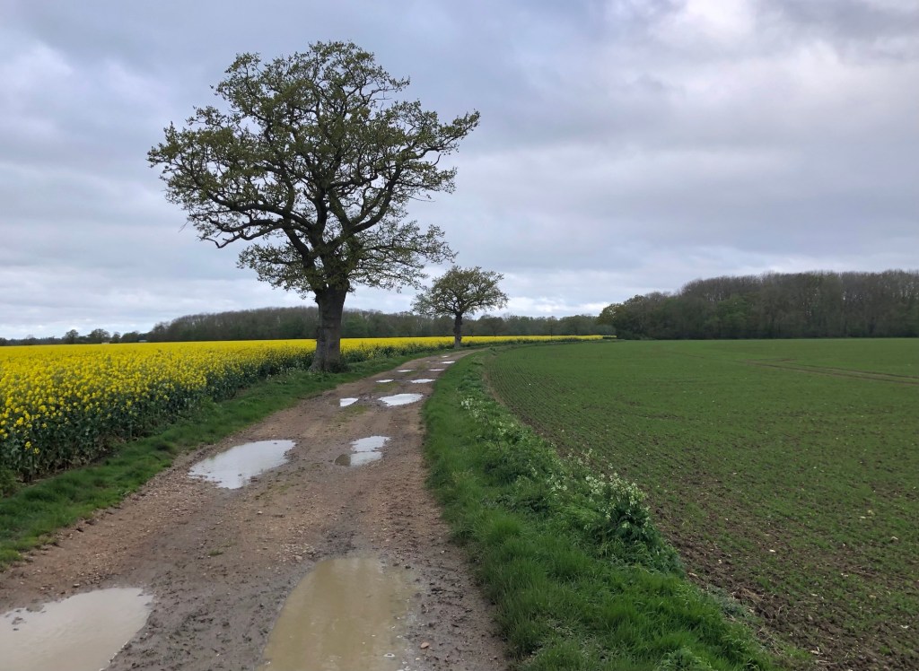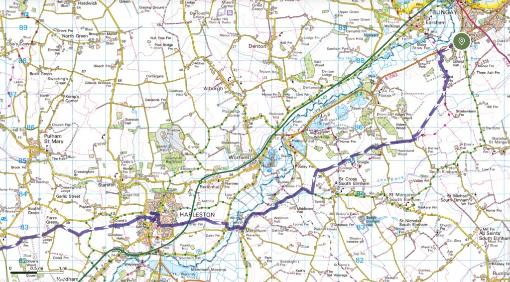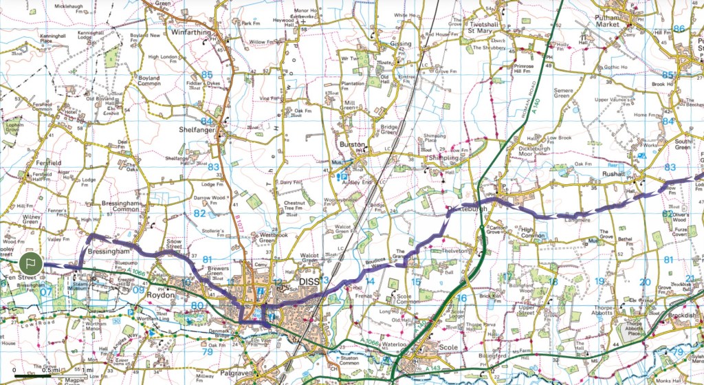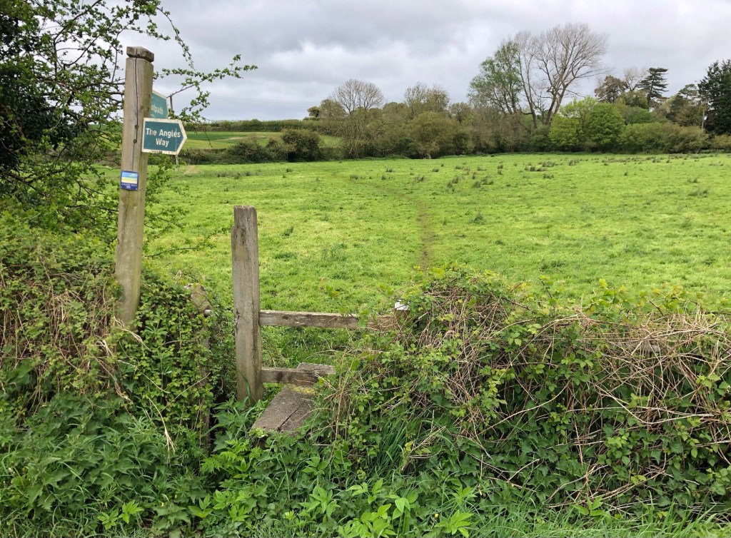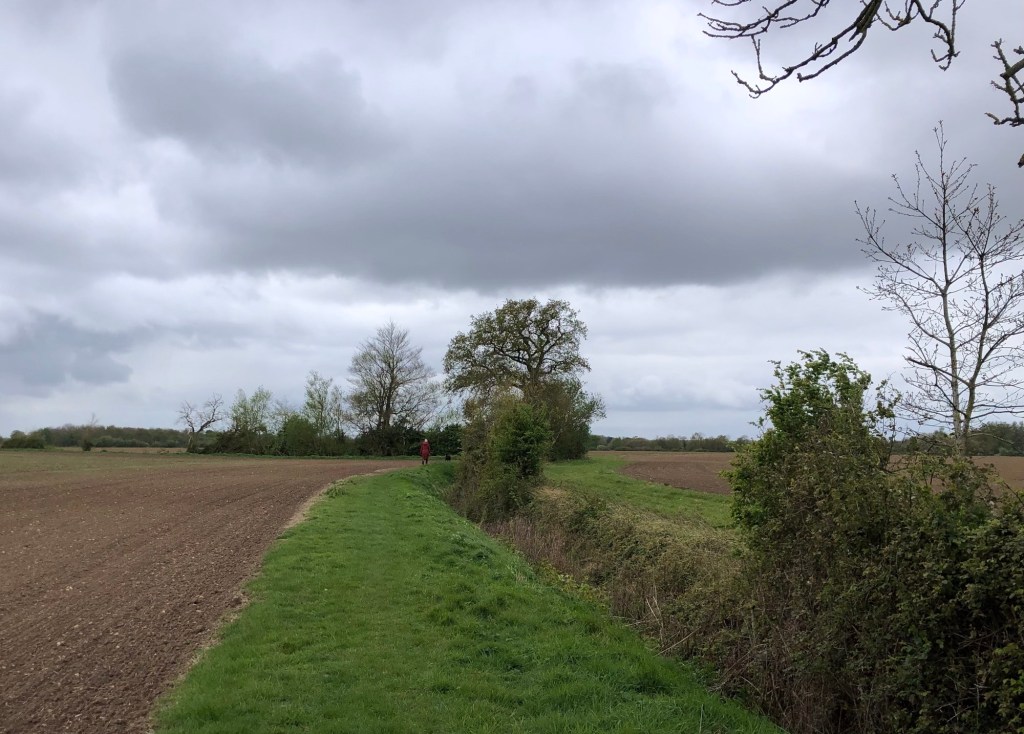 Aside from the moody weather, that I will return to later, my first long walking day on this LETJOG E2W adventure has met with two basic and unforeseen challenges: communication and sustenance! Last night my phone charger cable broke – goodness only knows why it chose this moment – hence limiting my phone power, and threatening my means of keeping in touch with the world and (perhaps more importantly) being able to navigate my path. Fortunately, with unfamiliar use of an actual compass on occasion, I made it to Harleston, where I was able to replace the cable and restore normal service. And then there is the task of finding food in the provinces on a Monday or Tuesday evening, seemingly a nationwide problem these days outside of the main population centres – last night, with all the pub kitchens closed, I found the only hot food to be had in Bungay at the local takeaway: this evening I took no chances in Bressingham and dinner (albeit cold and eaten at my B&B) was courtesy of Morrisons in Diss.