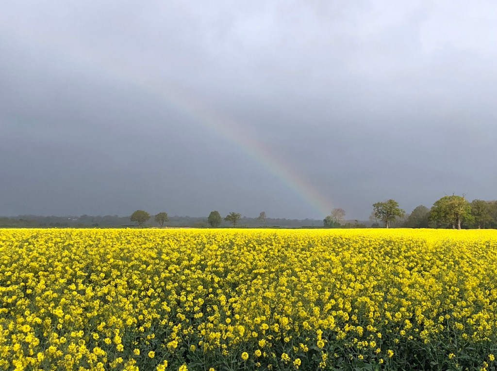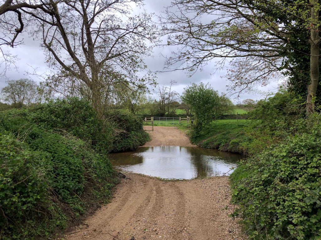 So, I shall remember this day of my LETJOG E2W trek as one of obstacles to be overcome. But, as ever in the outdoors, compensation is to be found at every turn: a rainbow, a stoat darting across my path, hares in the green cornfields, evidence aplenty of moles and badgers, pheasants squawking into the fields at my approach, and songbirds doing their best to be heard above the gale. Walking into the wind is not the easiest but, with the huge East Anglian skies open before me, this has the advantage of being able to observe the prevailing weather and some advance notice of oncoming downpours and respites. All ended well today in this corner of our mad world, and I can retire now reasonably well-fed, and with communication and navigation restored!
