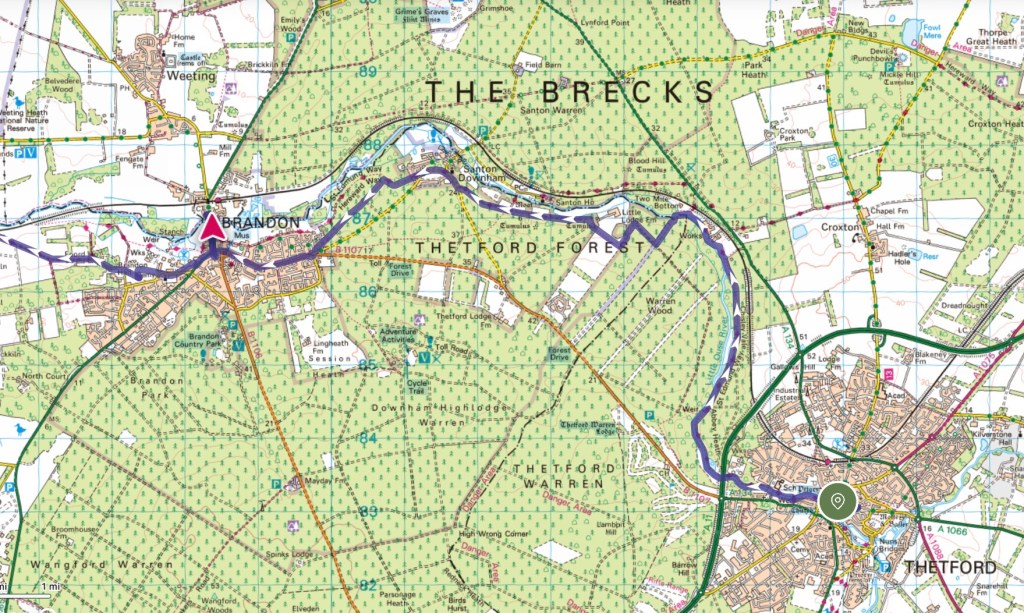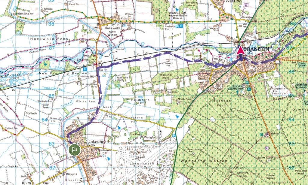 With the weather fine, and with good paths over the flat terrain and easy navigation, I made swift progress today. Having all of these things in my favour I decided to ‘over-walk’ my original destination of Brandon, where I had accommodation booked, to reach Lakenheath and so reduce my next day’s mileage. Planning a route a few days in advance is always a challenge, and although I suspected a straightforward ramble today, I could not find a suitable place to stop over in Lakenheath. Never mind – I have a comfortable room here in Brandon tonight.