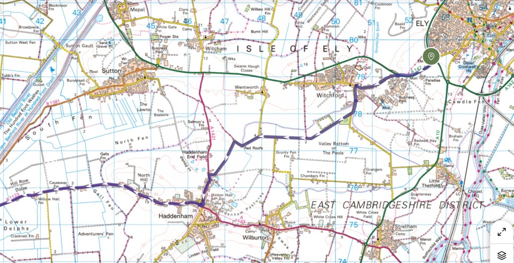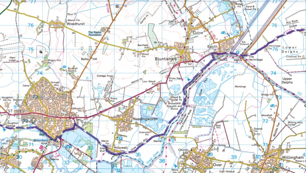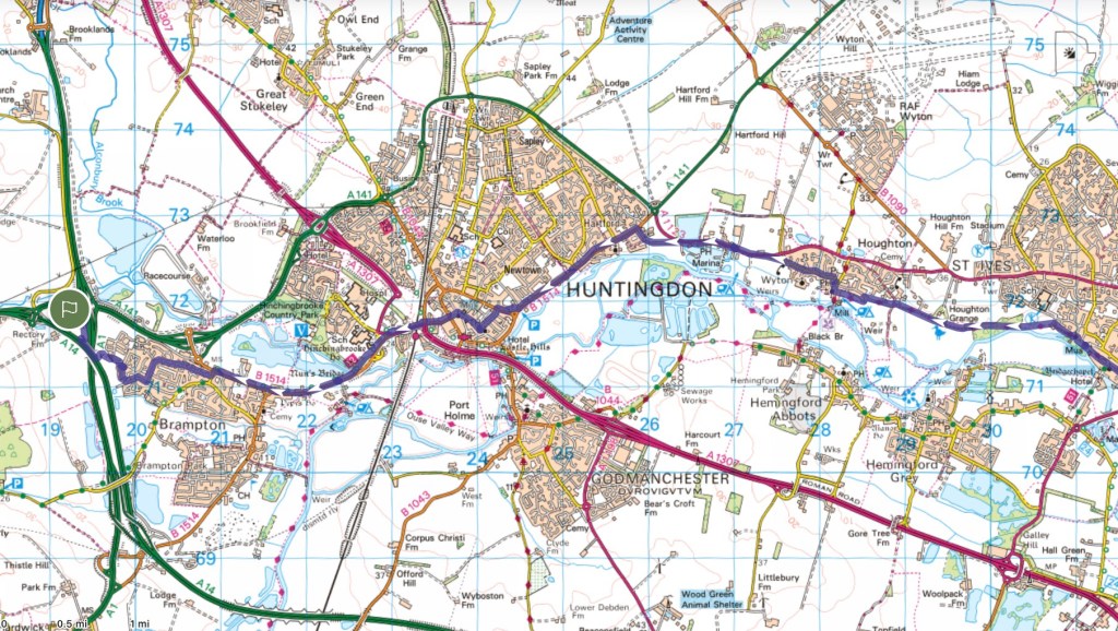 As with yesterday’s walk, my LETJOG E2W marathon today was a flat trek that took me across The Fens: ten miles on quiet lanes (more cyclists than drivers, but hard on the joints), ten somewhat more gentle miles along the Ouse Valley Way, and then the final seven through Huntingdon and Brampton on cycle paths and wide pavements. I can certainly feel my legs tonight, and also my shoulders from my backpack and the poling!