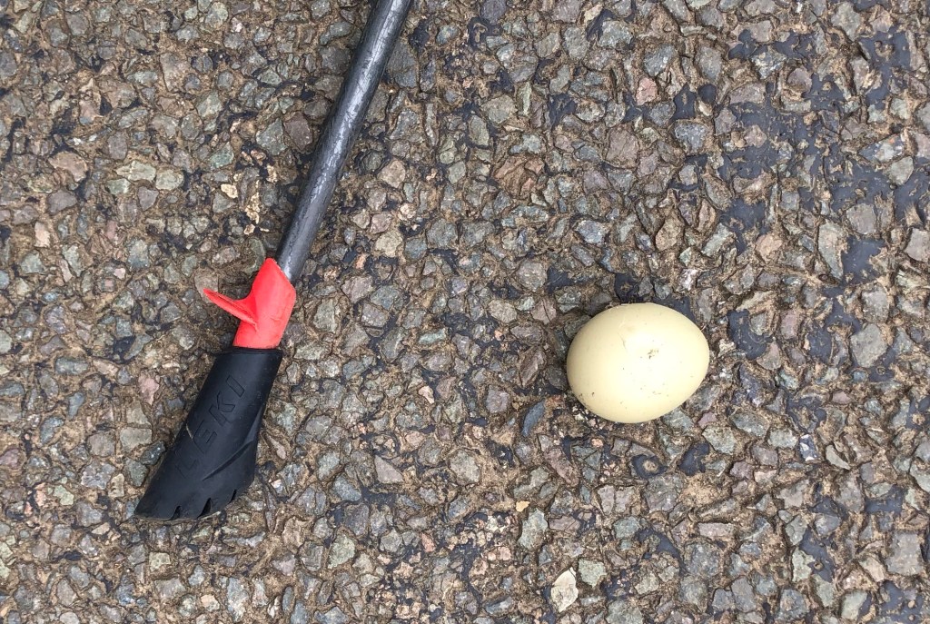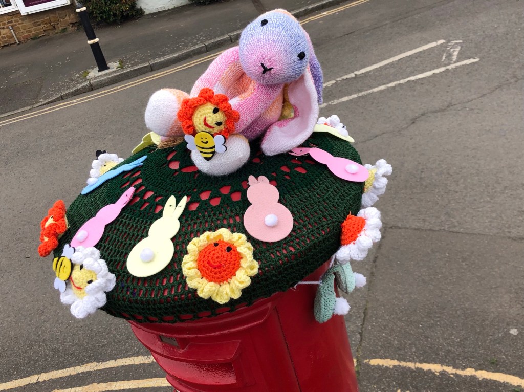 Delayed again, but at least, eventually, I made it out of Berkhamsted . . .. . . and back to Northampton, where I found a route through the Victorian terraces of the inner suburbs . . .. . . through parkland . . .. . . and finally, out of the town along the lanesA thatch and ironstone cottage in Upper HarlestoneA bird’s egg on the road – about 40 mm long – any idea what species?Repairs to the wall of the Althorp Estate . . . . . . some cottages and a gatehouse . . .. . . and a distant view of Althorp House itself At long last, the footpath off the lane, and into the woods . . .. . . emerging as a grassy track across pasture to Great Brington villageArriving in Great Brington, at the Post Office and the Althorp Coaching Inn (I have a feeling I have been to the latter some years ago) . . .. . . and looking out from the village to the hills beyondA glance back at the villageIn this field I nearly stepped on a sleeping hare – I don’t know who was more startled – but within seconds the hare was half a field away before I managed to get a (camera) shot offGlebe Farm, on the path down from Thornburrow HillThe brook, approaching Long Buckby . . .. . . where, as in Berkhamsted, the current knitting fad (that I understand is now termed ‘yarn-bombing’) is much in evidenceOn the footpath to Watford village: rape and wind turbinesRidges and furrows in the fields at Watford Gap . . .. . . all set to the hum of the M1 motorway