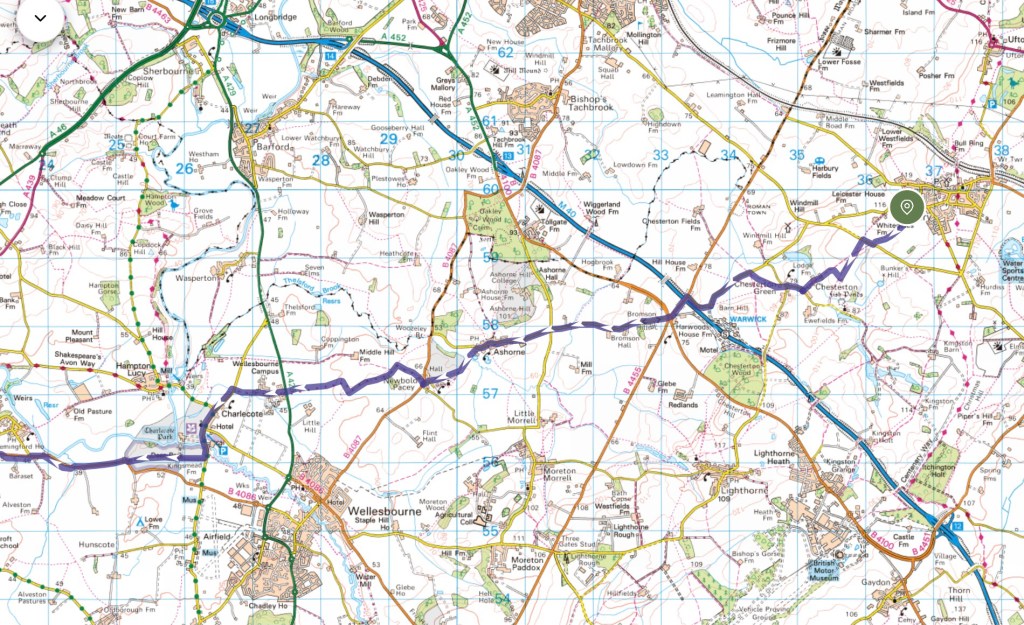 If the Midlands are considered the centre of the country then, to me at least, the part of Warwickshire (‘Shakespeare’s County’) around Stratford-upon-Avon, that I am now traversing, might be considered the ‘Heart of England’, not just geographically but perhaps culturally too. I have visited Stratford many times, and have worked on a number of projects in the region over the years, but not before this LETJOG E2W walk have I walked through these parts. As you will have seen from yesterday’s Blog the countryside around here is magnificent, and today’s route, nearly all off-road apart from some very minor lanes, met with all my heightened expectations.
