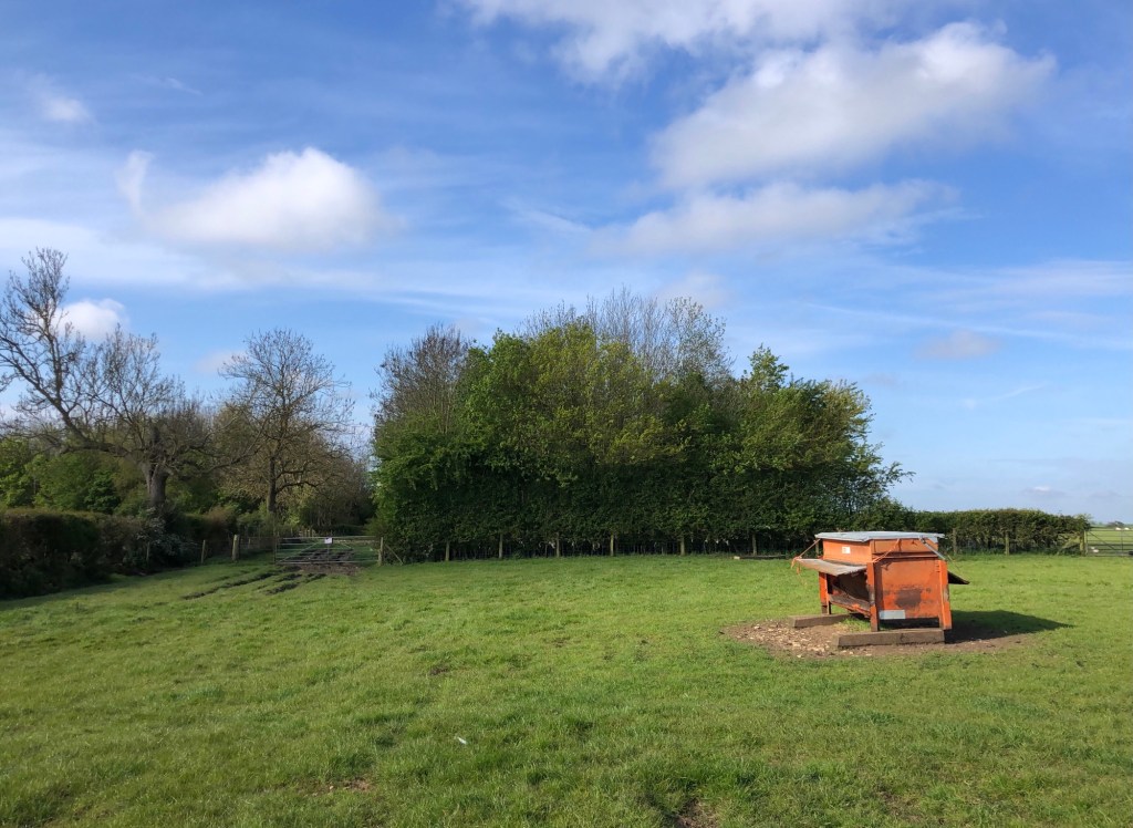 Blue skies and green pastures this morning, all of the way out of Harbury . . .. . . and some fine rolling country ahead of meAt Lodge Farm these few cattle chose to be insideThe M40, looking south to the Warwick Services turn-off – it seems I can’t avoid these places, given my recent visit to Watford Gap!Soon though, it was back on the field paths . . .. . . and a lovely approach to Ashorne villageA rural postbox . . .. . . and a car like no otherThe grassy path to Newbold Pacey . . .. . . quite stunning!This path runs through future woods . . .. . . to fields being converted into solar farms – I have not researched the full environmental costs and benefits of these installations, but many locals seem opposed to them, presumably on aesthetic grounds, despite the land between the panels still being capable of use for sheep grazingThis heavily rutted track made for a difficult mile or soAt Wellesbourne Campus, part of Warwick University, an unusual facilityThe gates to Charlecote Park . . .. . . that walkers such as I are allowed to transit . . .. . . so long as we do not stray from the line of the yellow postsThe deer are not subject to such restrictionsEventually, after following some unofficial footpaths along field sides to avoid the traffic on the main road, I made it to busy Stratford-upon-Avon, where the Theatre and the swans were resplendent in the spring sunshineA lunchtime feeding frenzy for this bevvy‘He’s behind you’ – I’m not sure if that particular line was written by The Bard?!Into the town centre . . .. . . and a more impressive statue of William Shakespeare on Henley StreetLeaving town via the market . . .. . . and out to Anne Hathaway’s Cottage in ShotteryAnd on the subject of residences, I have seen a number of new estates being built on the edges of many of the towns I have walked through on my walk – note the pre-formed gable-end panels, that appear to be made of glass fibreTiptoe through the bluebells . . .. . . beside another solar farm . . .. . . and along this impressive avenue of oaks . . .. . . to my destination at Binton
