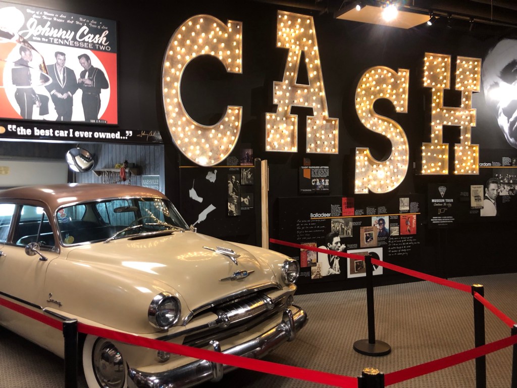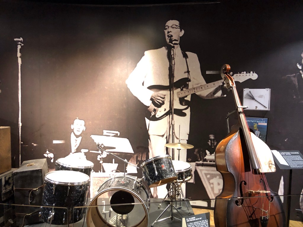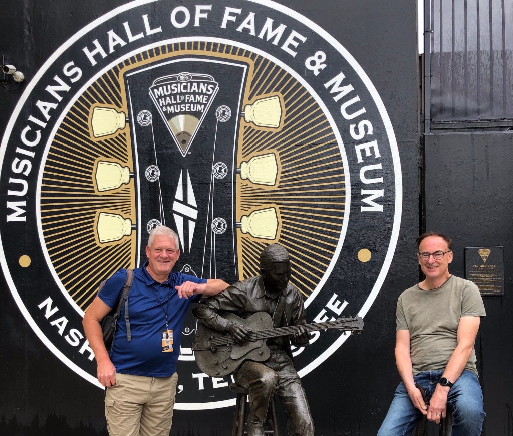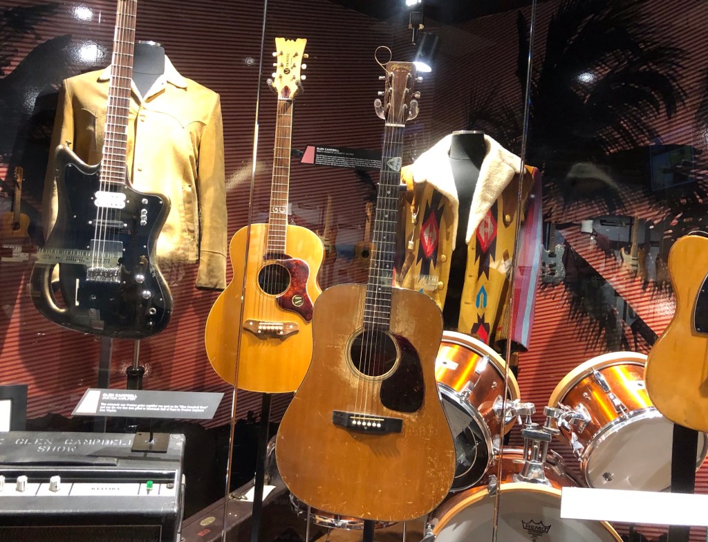 Next morning, on our thirty-minute walk into Downtown that was to become quite familiar, we passed through The Bicentennial Capitol Mall State Park, with views towards the Tennessee State Capitol building and the city centre beyond . . .. . . on our way to the Country Music Hall of Fame . . .. . . where the stars are alignedThe exhibition features the sounds, instruments, costumes and artefacts of Nashville over the decades . . .. . . from Elvis’ gold-plated Cadillac . . .. . . to Gram Parsons’ ‘Nudie Suits’ . . .. . . and right up to a present day tour busAnd there is even a chance to meet with the stars . . .. . . and to reflect upon their achievementsNext, a first experience of Downtown . . .. . . and a country covers group in Nudies Honky Tonk . . .. . . before a dinner of ‘Texan Smoked Brisket & Chips with Fried Bread’ (or a more healthy salad, as the case may be) in Von Elrod’s Beer Hall, near to our house in GermantownBack into Downtown for the evening show at the Ryman AuditoriumFirst up, ‘Montana-bred, Nashville-based’ rock/bluegrass band, TopHouse . . .. . . and an interval chance to meet Joe Larson, lead vocalist and guitaristThen the main act – the award-winning Molly Tuttle and Golden Highway, a renowned five-piece bluegrass band . . .. . . later joined by an array of iconic guests from the genre, that included Del McCoury, Bryan Sutton, and Lukas Nelson (son of Willie): a very special one-off evening that we were most fortunate to attendNot a bad ending to a very full first day in Music City!Next morning, whilst two of our number made an out-of-town taxi trip to ‘The Hermitage’, ex-President Andrew Jackson’s plantation home, Mike and I stuck with music history at the Musicians’ Hall of Fame, a museum that honours not just the stars but the process and all the people who, ‘regardless of genre or instrument’, have brought music to the world . . .. . . from the origins of recorded sound until the present dayBuddy Holly in concert . . .. . . a collection of Glen Campbell’s instruments and costumes . . .. . . Johnny Cash’s car and concert signage . . .. . . and a temporary exhibition on the life and works of Fleetwood Mac’s Christine McVieA chance to lay down an instrumentation track – for Mike, at least!Hanging out with ‘Country Gentleman’ Chet Atkins, a central player in the creation of the ‘Nashville Sound’ . . .. . . and then into Downtown again, to watch the revellers amidst the party buses . . .. . . before taking in some country covers from Wendy Newcomer and her band, the Nashville Cats, in Robert’s Western World – one of the many lively honky-tonks on BroadwayAt The Listening Room Café, a venue dedicated to up-and-coming singer-songwriters, the team reunited for dinner . . .. . . whilst enjoying the sequential acts from singer-songwriters Adam Craig, Josh Phillips and Matt Alderman: Phillips (centre, and playing) performed his recent self-composition ‘Dirt Cheap’, a cover of which, by Cody Johnson, is currently riding high in the charts‘Nights on Broadway’