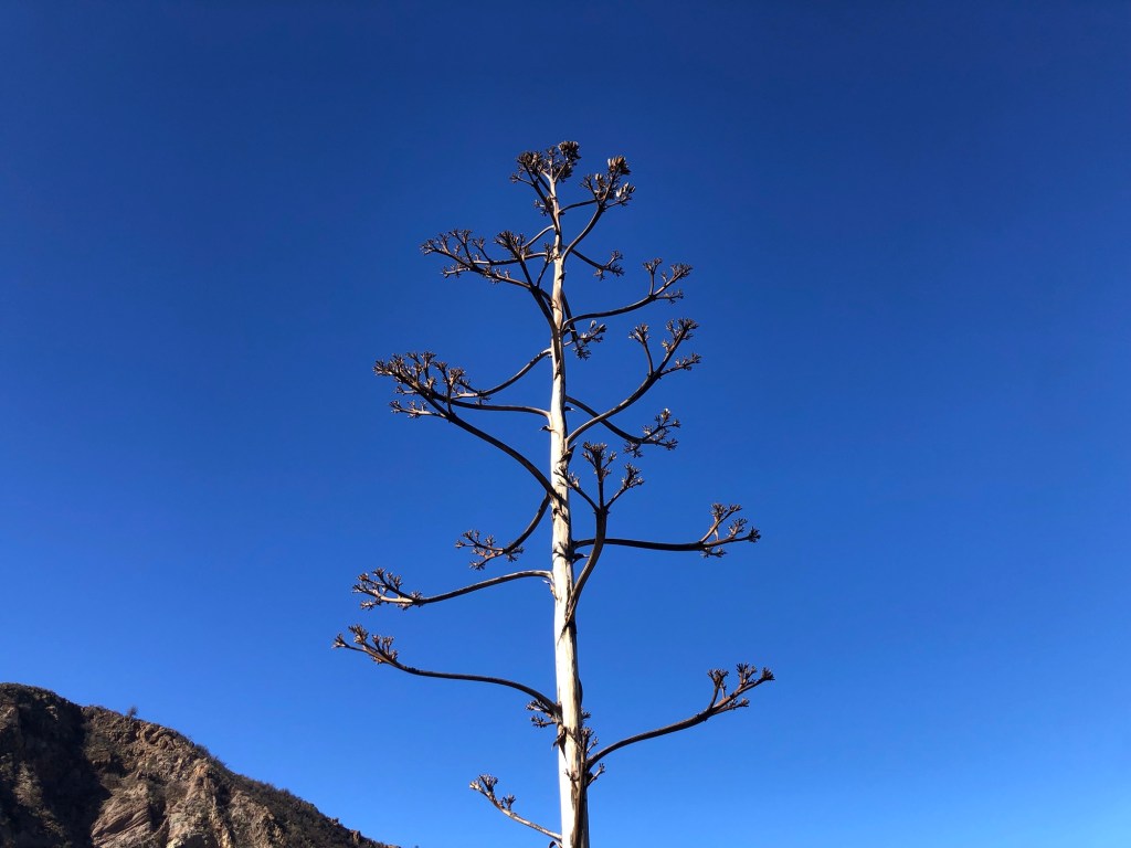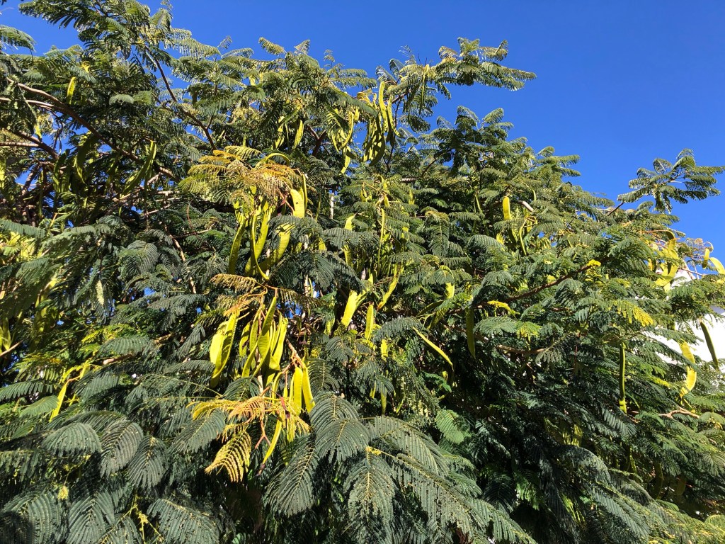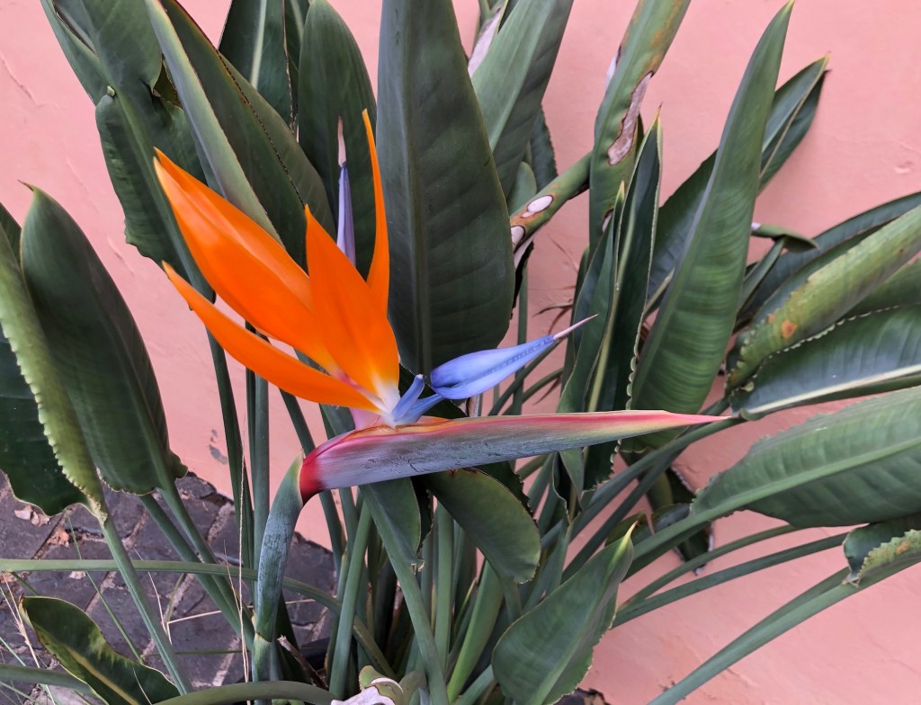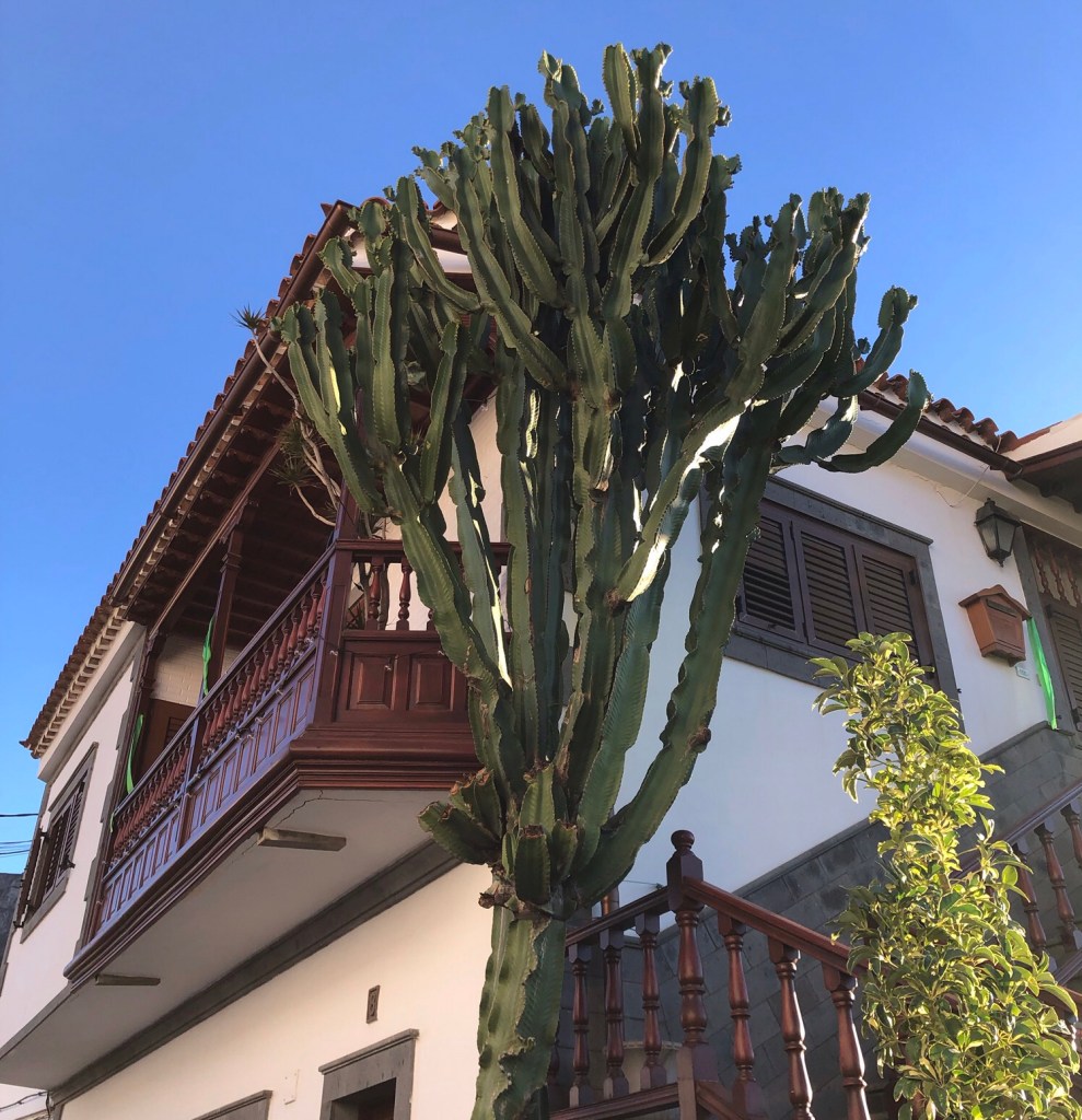 A ‘bird of paradise’ flower’ . . .. . . a native ‘rock rose’ . . .. . . and a plant that we spotted on the Caldera de Bandama rim but have been unable to identify (further research needed)!A more familiar banana palm, on the plantation next to our hotel in ArucasA thistle on the pine wood floorAn agave plant . . .. . . and a redundant agave stem from an earlier flowering seasonPrickly pears . . .. . . and a spikey resting place!Again we have yet to identify this tree with fern-like leaves and huge seed pods . . .. . . though there are plenty of more familiar, and fruitful, orange trees in the towns . . .. . . as well as some spectacular cultivated cacti plants