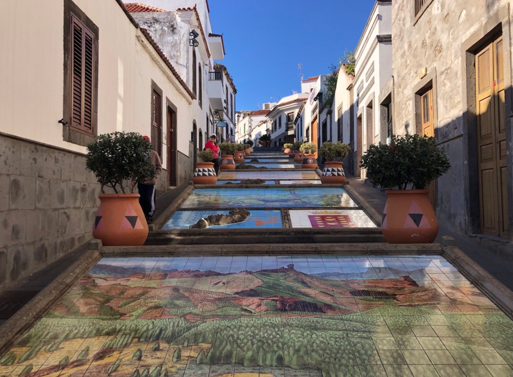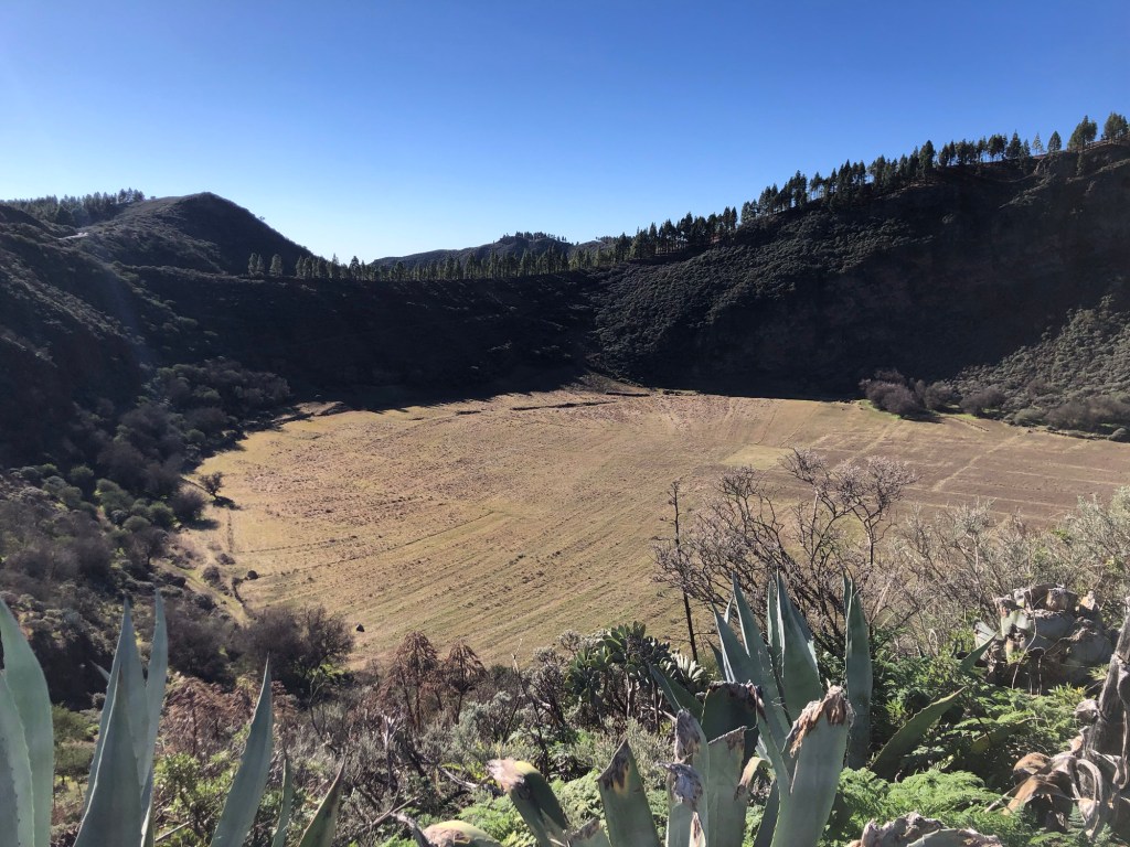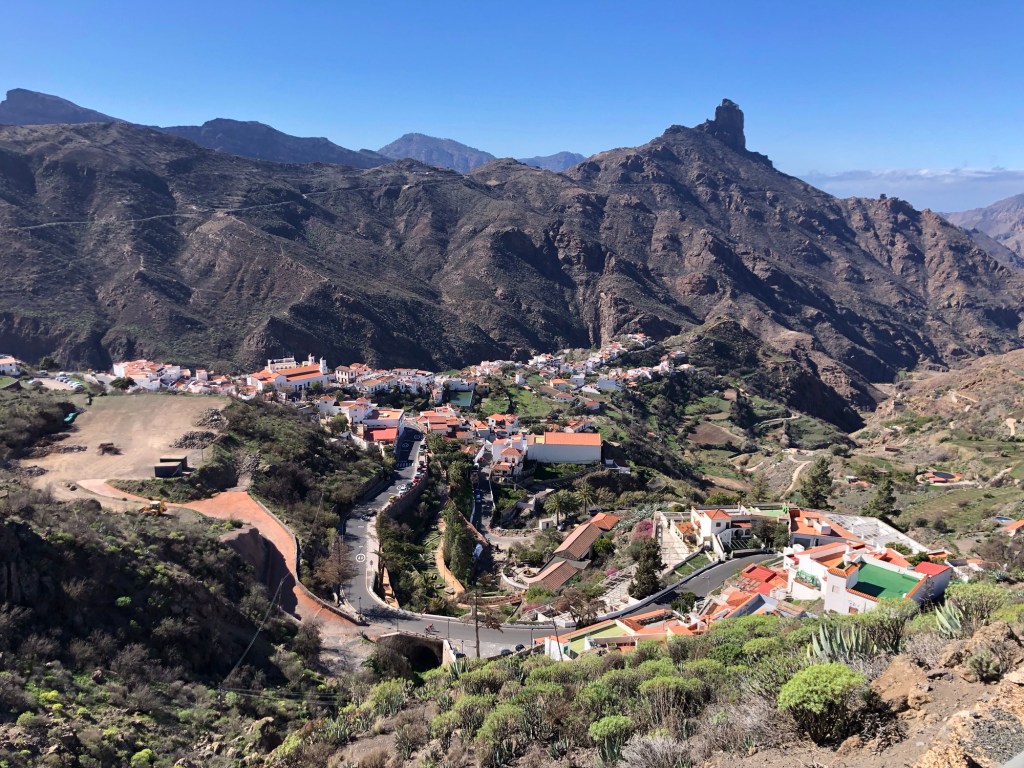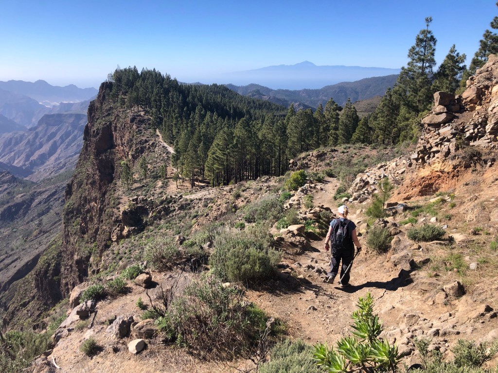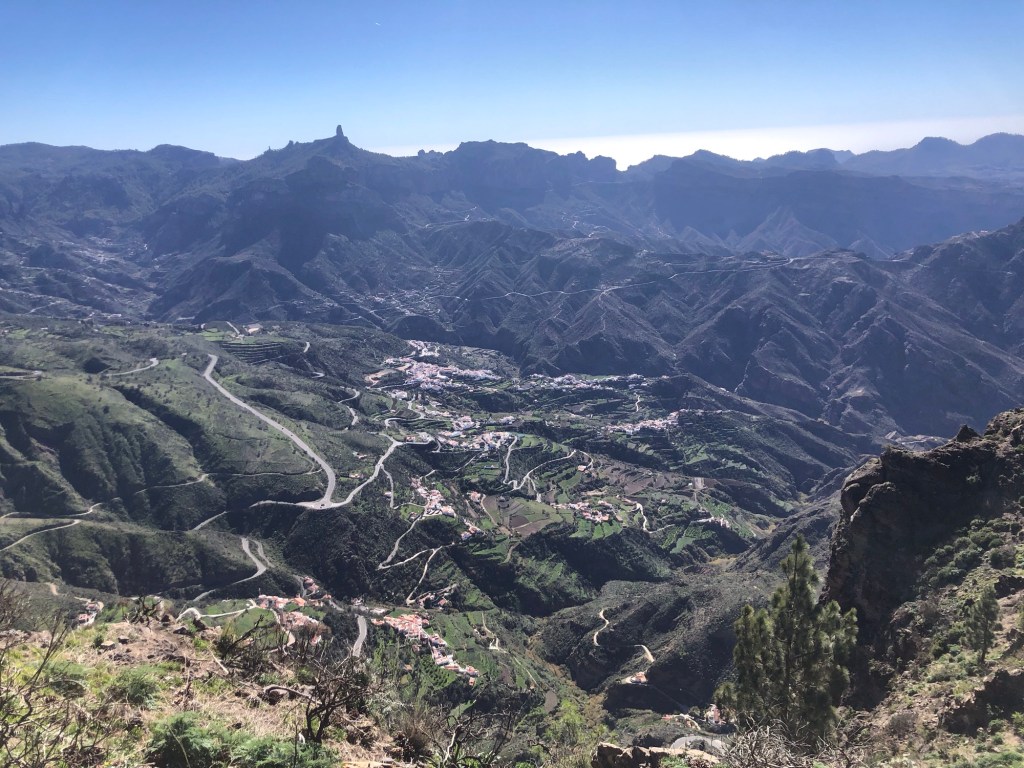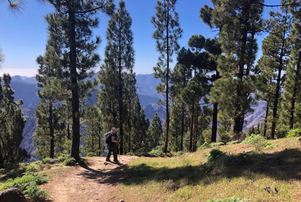 Our base for the first three days – La Hacienda del Buen Suceso, set within a banana plantation just outside the town of Arucas, near the north coast of the islandDay 1: The Caldera de Bandama is technically a maar (rather than a caldera), a volcanic crater formed when groundwater comes into contact with hot lava or magma, causing the volcano to ‘blow its top’ – this happened around 2,000 years ago in this case, making the eruption one of the most recent on Gran CanariaOur walk took us around the jagged and undulating rim of the crater . . .. . . with views aplenty, from the tops to the oceanAbove us loomed the 570-metre high peak of Pico de BandamaThen it was time to descend the 200 metres to the floor of the crater . . .. . . a lush oasis and a quite special place, that boasts volcanic ash of various colours and some plant species, such as bugloso (a variety of borage) that are unique to the island (and indeed to the world)!Day 2: Today’s walk started from the small hill-town of Firgas, where the centre is adorned with ceramic street furniture and features . . .. . . before a walk out into the countryside, and a prolonged descent . . .. . . into the Azuaje GorgeCrossing the stream bed at the bottom of the ravineA small wayside shrine . . .. . . on our way back up the other side of the gorgeViews to the north-east, over the island’s capital, Las PalmasWe reached our end-point by the church in the town of Moya, where we took a taxi back to our hire car in FirgasBack at the Hacienda after our exertions, we enjoyed a shot of the local banana liquorDay 3: We drove up into the hills, to our new base at the Hotel Fonda de la Tea in the town of TejedaContemplating the route up from Cruz de Tejeda, at 1,500 metres of elevation, where our third day’s walk started . . .. . . before climbing to the ridge-top on our path towards ArtenaraTurning south now, with the ridge ahead of us and some interesting rock formations just below usWhich way now?Just keep following the ridge line!Some fabulous views over Tejeda town well below us, and up to the standing rock of Roque Nublo on the far side of the Tejeda Caldera, the latter being a huge elliptical crater measuring around 10 miles across and 15 miles long, the result of a massive ancient volcanic explosionInto the woods on another scenic section of the path . . .. . . before we reached some prehistoric troglodyte cavesStarting down at last . . .. . . towards our destination of Artenara – and in the far distance a view of Mount Teide, across the sea on TenerifeArtenara village, at 1,270 metres above sea level, is the highest settlement on Gran CanariaDay 4: Our starting point today in the wonderfully fragrant pine woods of Llanos de la Pez . . .. . . soon emerging for some clear views of Roque Nublo – our circuit would take us to the base of the island’s central marker, that stands at 1,813 metres above sea levelAs ever, a climb . . .. . . to the top of Montañon (1,762 metres)Then a rocky path down, made easier in parts by some newly-installed steps!After a fine picnic lunch at the Degollada de la Goleta at the base of Roque Nublo, another climb awaited us . . .. . . back into the pine woodsSome colourful volcanic debris . . .. . . and a final view of the rock . . .. . . before the drive back to Tejeda, in time for ‘Happy Hour’Day 5: From the viewpoint near Cruz de Tejeda, on the way to the start-point for another fine day’s walk . . .. . . that set off from the rim of the small crater of Caldera de los MartelesAfter exploring the crater a prolonged climb ensued, first along a pumice track, strewn with huge fir cones . . .. . . and then up through the pine woods at the head of the Barranco de Guayadeque ravine . . .. . . eventually emerging onto a high ridge, with views to the ocean off the southern coast of the islandAfter several miles the path turned back on itself, into the Barranco (ravine), through bright red volcanic soils . . .. . . that support the lush vegetation of cacti, agave plants, almond and fig treesA fabulous promenade . . .. . . affording more huge vistasThe start of the 300-metre climb back up . . .. . . and a welcome break whilst this determined herd headed past, downslopeA roadside stop on the drive back, for a far-reaching view across the water to Tenerife and its volcanic summit of Mount Teide (which at 3,718 metres of elevation is also Spain’s highest point)Day 6: A shorter walk to finish, on the hills above TejedaAfter a steep climb on the path towards La Culata, some great views over to Roque Bentayga . . .. . . and above us to Roque NubloDescending once more into Tejeda . . .. . . for a visit to the town’s small museum of medicinal plantsAn afternoon drive out to Roque Bentayga . . .. . . for some huge views in every direction around the ancient calderaBack in Tejeda for the sunset after another great day, and with a memorable week of walking and exploration to reflect upon