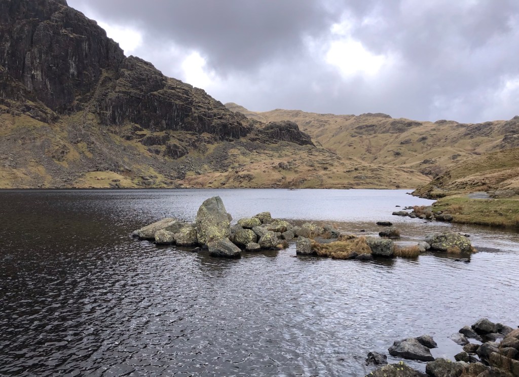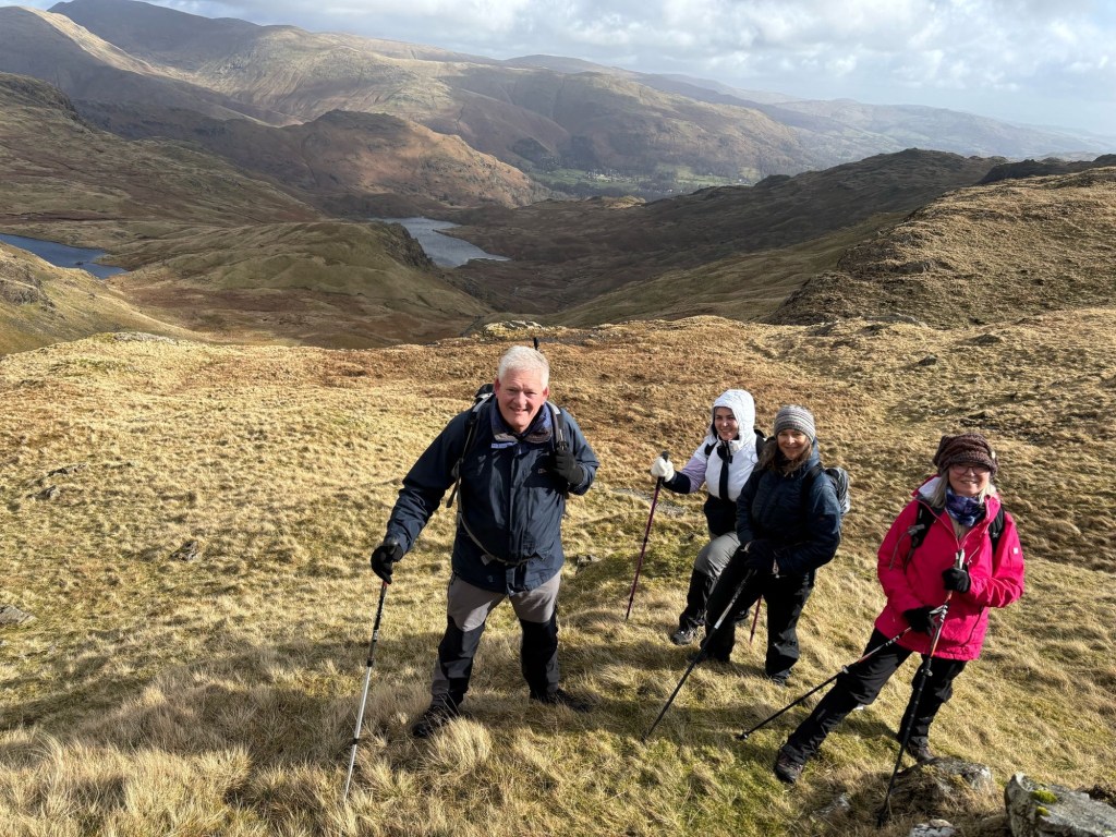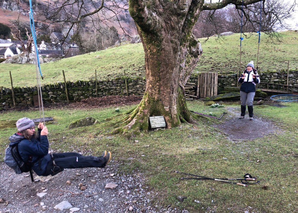 Saturday morning: an early start, and four trains, was rewarded by a dry day for our walk, as Rachel and I set off from Windermere station on our way to AmblesideAround eight miles today, just as a ‘loosener’A short climb from the town, and some early views of the lakeA fabulous study in tree and fern!Down into the dale . . .. . . and up over the first of many a stileFabulous views aplenty . . .. . . from the hills above Lake WindermereDiversion required . . .. . . and then the descent . . .. . . into Ambleside – where we stayed in the Unicorn pub (an old haunt of mine from previous escapades)The hearty Sunday breakfast on offer at Bellis Bistro in Ambleside provided the fuel we needed for today’s rather wet Lakeland fells . . .. . . although the conditions dictated a somewhat less ambitious ramble than we had first intendedLeaving Ambleside by the 17th-century Bridge HouseWet, wet, wet in the town’s Rothay Park . . .. . . where I took my final shot on the walk (before burying my phone in my backpack as the heavy rain took hold)Five very soggy miles later, and some welcome local brews in Elterwater’s Britannia Inn, where we met up with several of our walking group for some lunchtime shelter and sustenance . . .. . . before settling into the hostel quite readily!Next morning, rain-free Monday, the team were all kitted out early, and ready to rollDividing into two groups, seven of us set out on a twelve-mile sortie of the topsAn initial three miles on the flat in Great Langdale . . .. . . with a stop for play-time . . .. . . before the start of the prolonged climb from Dungeon GhyllCrossing Stickle Beck . . .. . . go for it Hil!Stickle Tarn, around the mid-point of our climb, at 473 metres of elevationThen onwards . . .. . . and upwards . . .. . . on our way to the plateau of High RaiseMade it – rather blowy up here . . .. . . on the summit of High Raise (762 metres)Wild, as well as windy . . .. . . as we started back downA stop for views to the south . . .. . . as we descended once more into Great Langdale Not a bad place . . .. . . for a photo-stopJust one more stream to negotiate before our return to the valleyCommunal supper is a hostel highlight, and a chance to swap war stories from our day on the fellsTuesday, and a lower-level walk today of around eight miles, below the cloudsElterwater snowdrops . . .. . . and then our first stop, overlooking the slate quarry . . .. . . before a short climb, past Little Langdale TarnLooking down over Greenburn Beck and to Slater’s Bridge . . .. . . steady as she goes!In Cathedral Cave, with our choir in the backgroundNearing Skelwith Bridge, our lunch-stop . . .. . . and suitably refreshed, the easy path back, alongside Great Langdale Beck, to ElterwaterThe final furlong . . .. . . and a chance for the keen-eyed to study this topographical map depicting the heart of the Lake District, our playground of the last few days