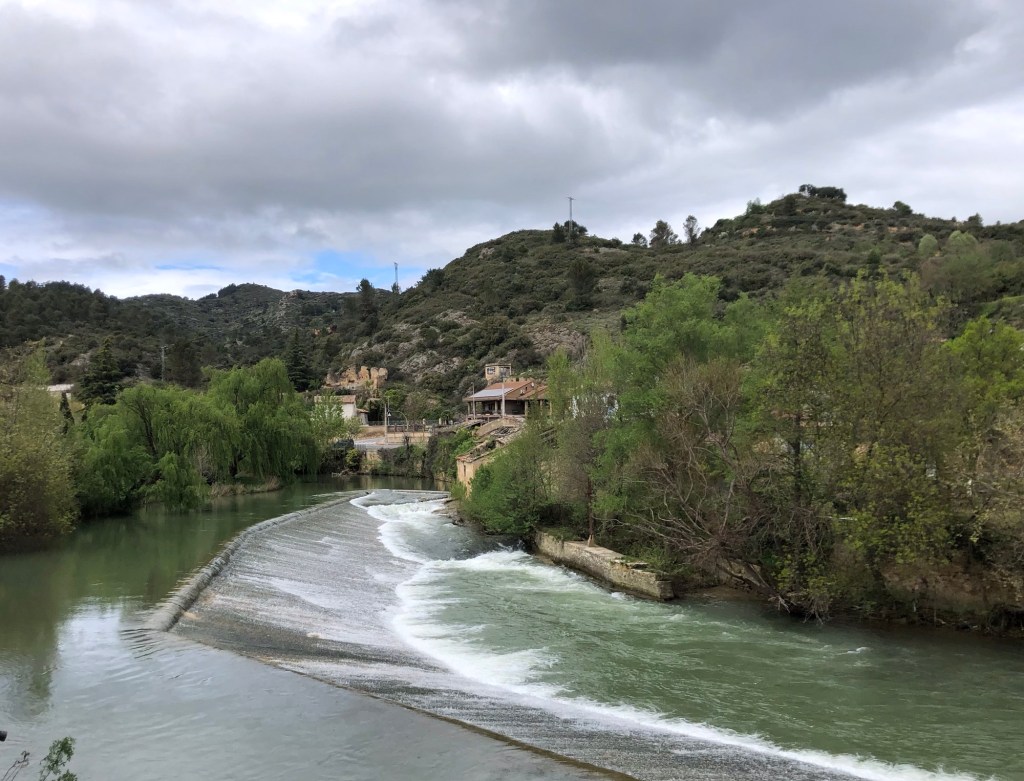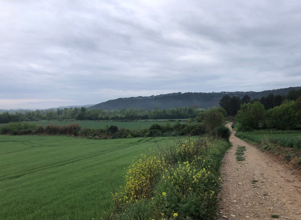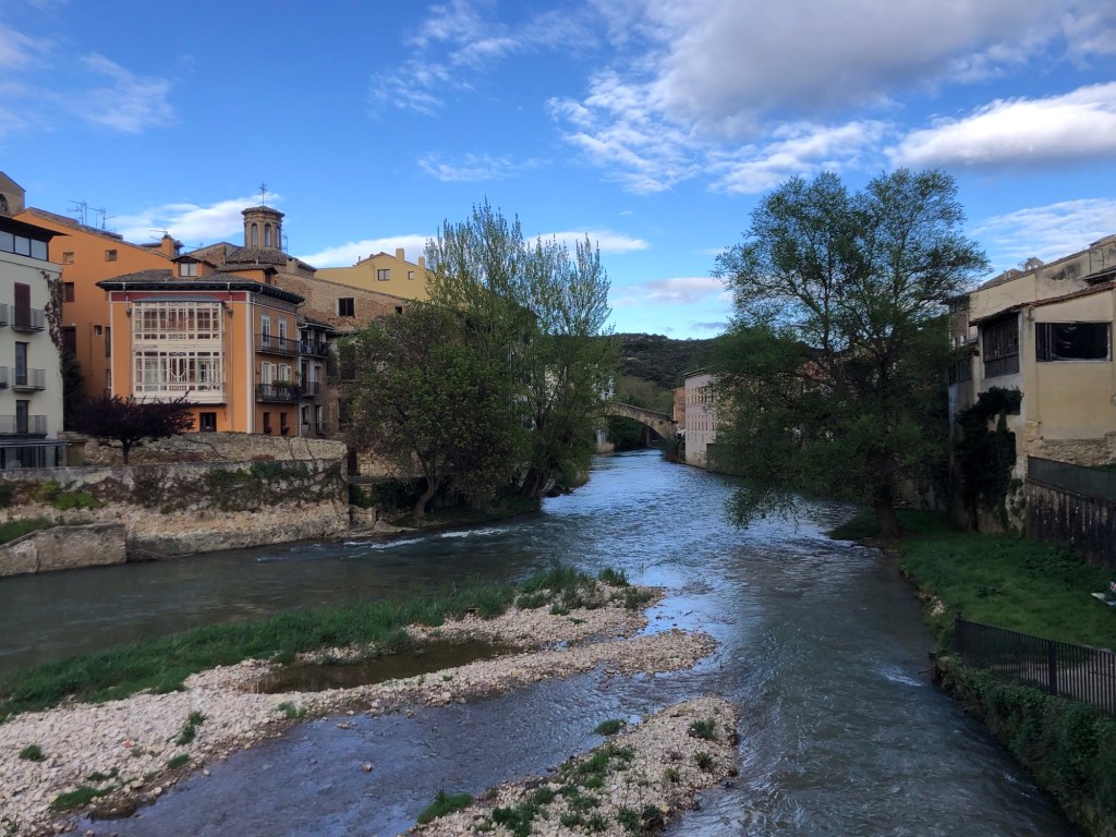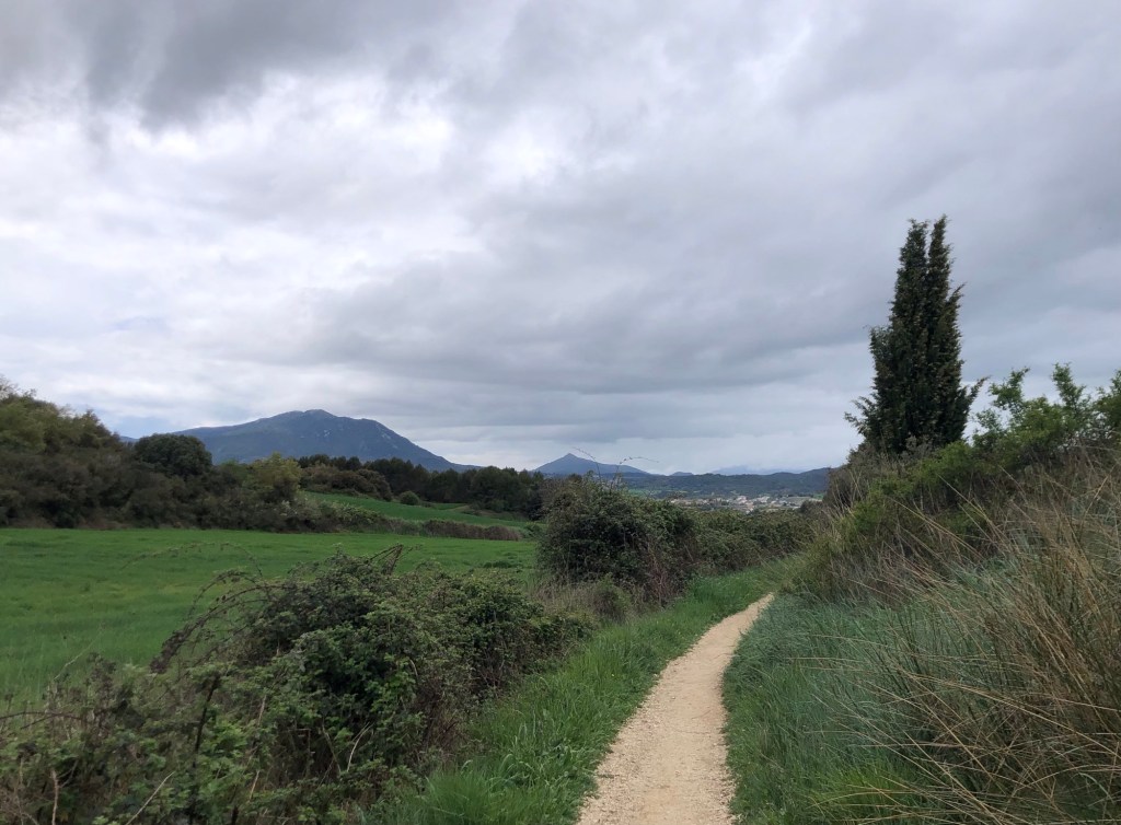 This morning dawned grey, although thankfully without the rain that followed last evening’s thunderstorm, and my quiet start to today’s section of the Camino (Stage 5 on my plan), away from Puente la Reina, followed close to the tree-lined banks of the Rio Arga. I had first met this river, just as a large stream really, three days ago at Zubiri, after my descent from the Pyrenees, but here, many miles downstream, its waters have gained width, depth and power, to become the dominant feature in a landscape of lush vegetation.