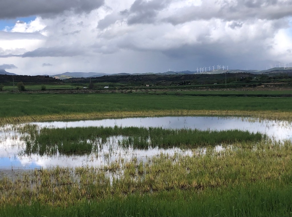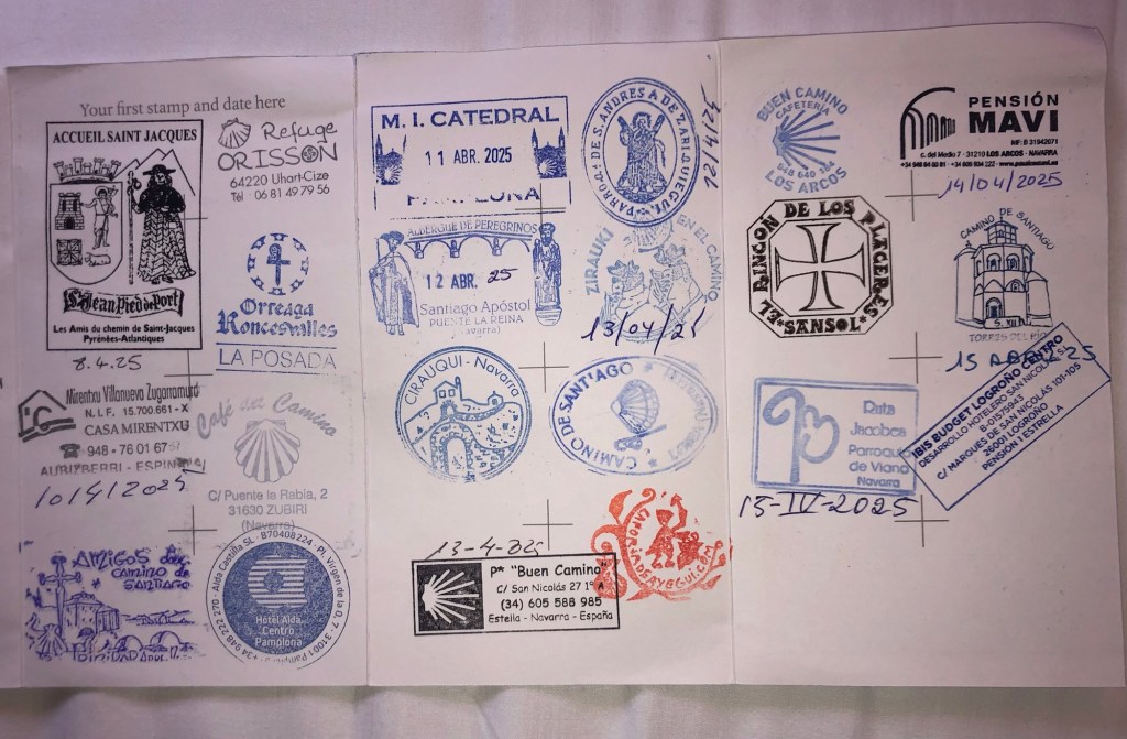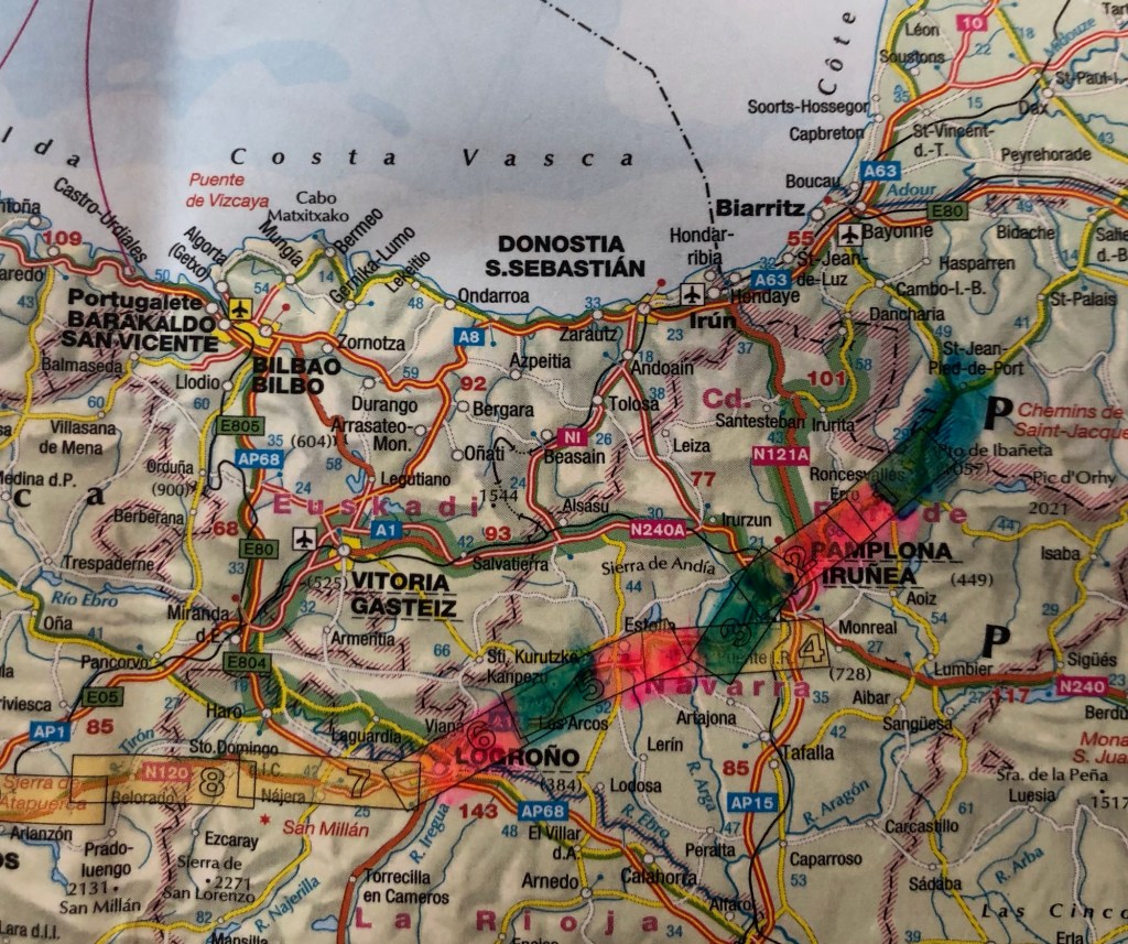 As a footnote, when I planned my Camino walk I divided the route into five sections for my own convenience. The first section, seven days, was the part from southwest France and through the Spanish province of Navarre, that I have now completed. As per schedule this section has taken me seven days in total, although I walked two long days at the start, and then had two nights and a rest day in Pamplona. The approximate cumulative totals so far read 163 kilometres (101 miles) covered, and nearly 3,500 metres climbed, taking me about 47.5 hours (including breaks) on the Camino path itself. In addition to these stats I have walked another 26 kilometres (16 miles) on diversions to points of interest and on my walking tour in Pamplona, as well as on my evening strolls in the towns and villages along the way. So far I have no strains or blisters (save one on the inside of a thumb from excessive poling) and, perhaps even more remarkably, I have not yet had cause to deploy my waterproofs.