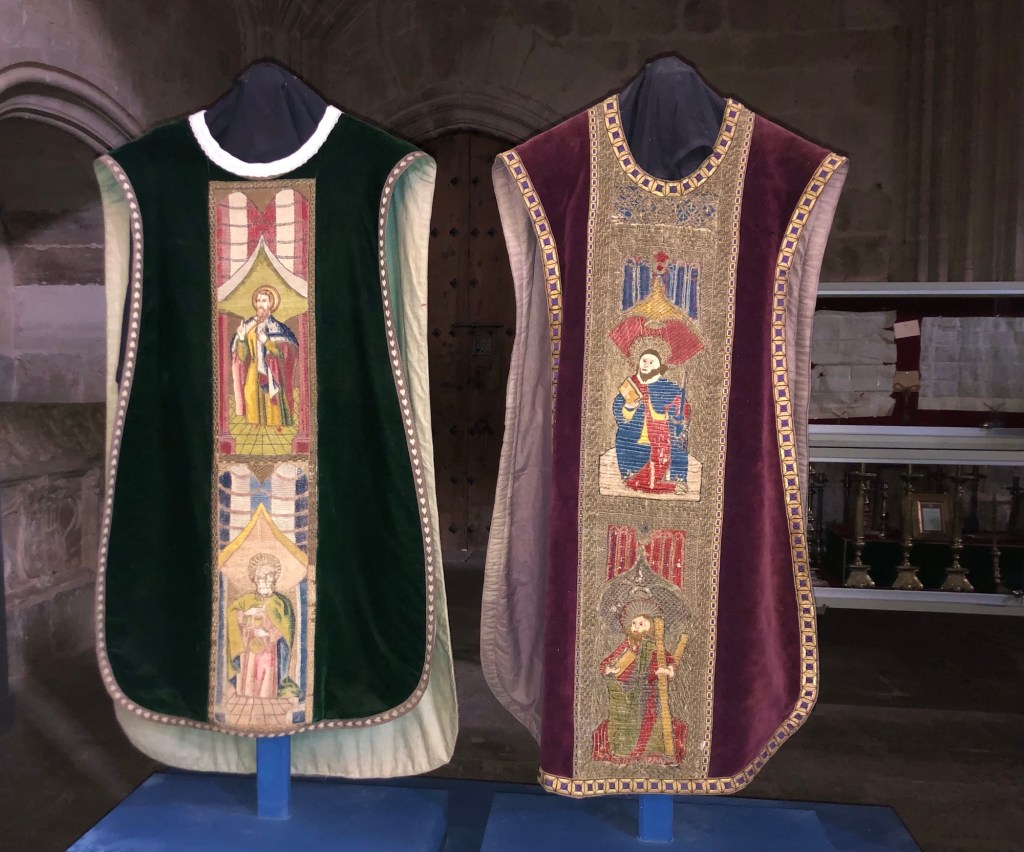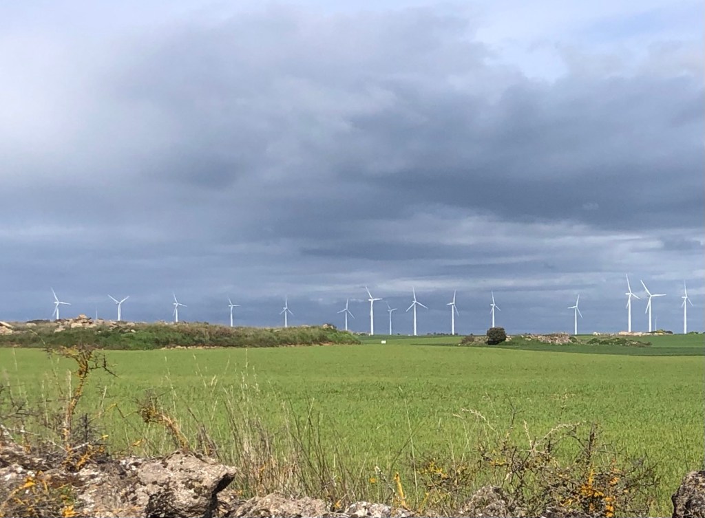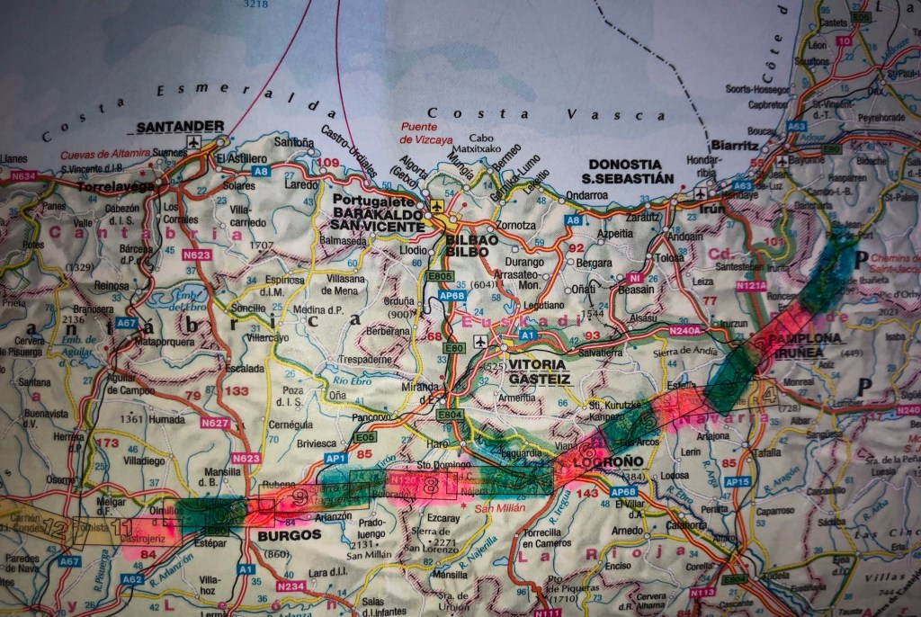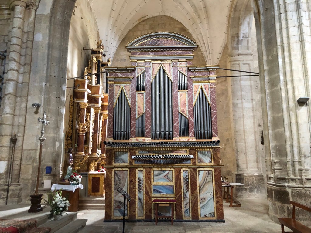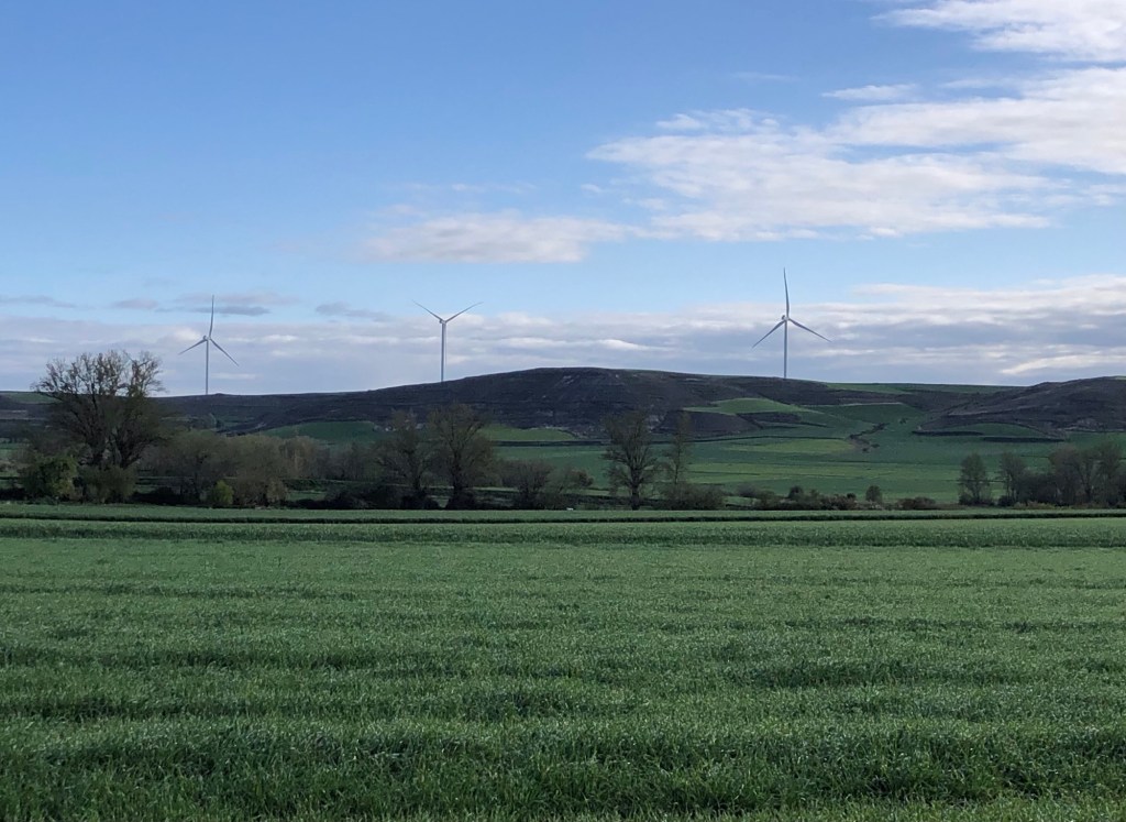 The gothic Church of San Romain in Hornillos this morning . . .. . . and the view beyond: the forecasters’ promise of morning rain was slightly amiss, as the showers had blown through by dawn – so my luck with the weather so far on this walk still continuesThe narrow street through Hornillos . . .. . . is lined with ochre buildings hewn from this local pitted sandstoneThe gentle climb out of the village . . .. . . leaving behind the low hum of the wind turbinesLooking back down the track as this small group of trekkers approached the top of the climb to the plateauSo flat is the top that the peak itself is difficult to discern (and the map merely states ‘Alto’, without a specific name for the peak), but I am claiming this cairn and cross as the summit, at around 950 metres of elevationThe line of trees in the shallow cleft ahead on the plain marks a small stream; this high region drains into the Douro system, a river that empties into the Atlantic Ocean through the Portuguese city of Porto some hundreds of kilometres to the west of hereWind turbines aplenty on horizons in all directions today – the raised topography and open country no doubt produces a good harvestA shrine by the waysideAround a bend, and there before me stood the pilgrim village of Hontanas, nestled in a cleft within the plateau . . .. . . a good place to find a morning coffeeThen a short descent to the verdant Odra valley . . .. . . a green and pleasant landA relic of something-or-other . . .. . . as the track continued down the valley . . .. . . and then parallel with the lane . . .. . . to reach the ruins of the 14th Century convent at San AntonThe road actually runs through one of the archesA good place for my picnic lunch – in the sun and out of the windBack on the path – and a first view of my destination of Castrojeriz. . . with my lodgings for the night conveniently placed near the entrance to the townHaving deposited my rucksack, I set off to explore – this pilgrim town has a main street over a mile long, extraordinary for a place of only 500 permanent residents . . .. . . although they all seemed to be on siesta when I strolled throughThe organ in the Church of San Juan . . .. . . that also houses an exhibition of medieval tapestries . . .. . . and 16th Century cassocksA ruined castle looks down on the town . . .. . . with views over the valleyTime to wander back to my digs, for dinner