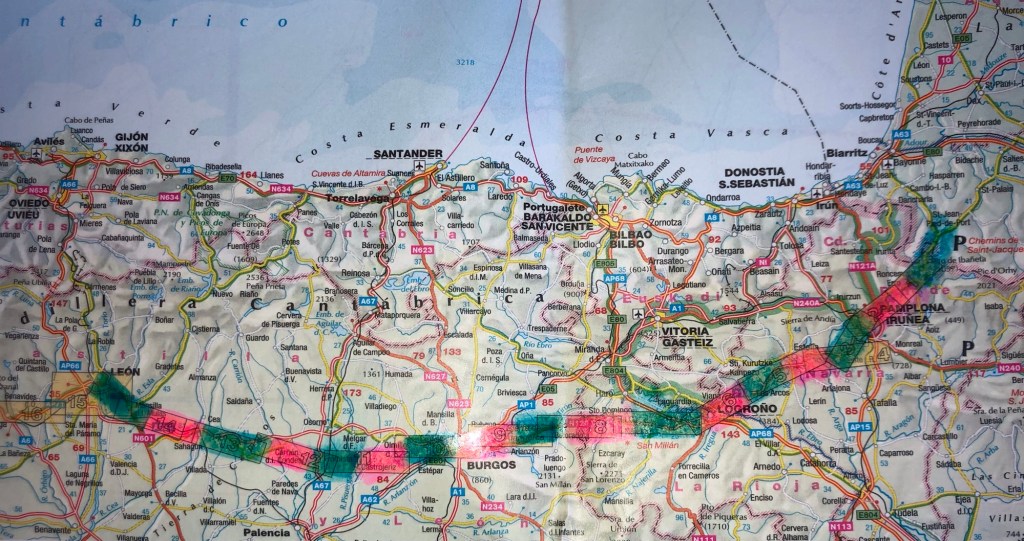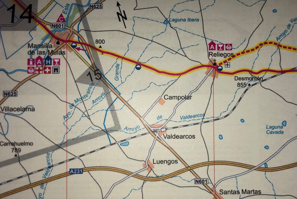 Having had my whinge, my walking day did have its highlights. The chill of the early morning air and the breaking light in Reliegos was exhilarating, and I had the path to myself for a good while first thing. The historic town of Mansilla, that I walked through before the coffee shops had opened was certainly impressive, and well worth a proper visit as and when I am back this way. I had a pleasant conversation with Marco, a fellow hill-walker who has lived in England and trekked extensively in many of the upland areas of our country that I know well. But possibly the greatest thrill of the day was cresting the modest climb of Alto del Portillo (910 metres of elevation) just after the town of Valdelafuente, and seeing León laid out below me, with the fields and mountains beyond. Having a full day tomorrow to explore this city adds somewhat to my sense of mild euphoria this evening at having reached another milestone on my Camino journey, and I will report back shortly on the experiences of my Rest Day in León.