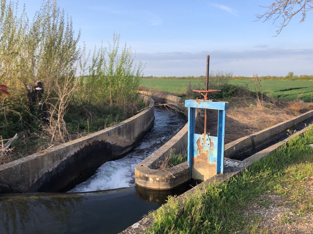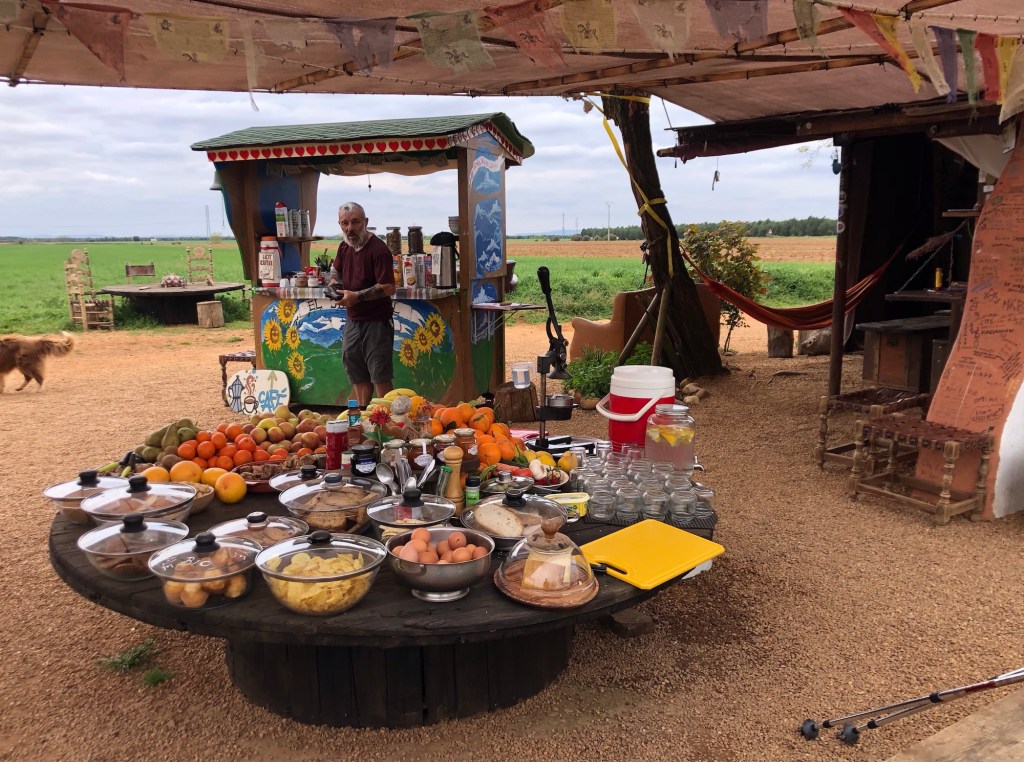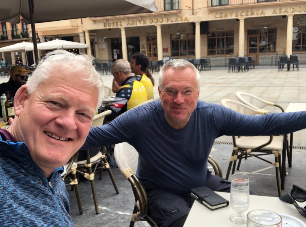 Back to the roadside paths for the first ten kilometres or so this morning . . .. . . and a chance to study the intricacies of the hydro-engineering of the local irrigation networkA water stop at San Martín del Camino . . .. . . and then I joined forces with Australian father and son Josh and Max . . .. . . as, at last, the way diverged from the highway, and towards the town of Hospital de OrbigoThe ancient bridge offers a scenic entrance from this side of town . . .. . . and ‘I spy a breakfast bar’, up on the opposite balcony!As ever, the storks . . .. . . had an eye on my sustenanceThen we were out into countryside . . .. . . initially across fields . . .. . . to the small settlement of Villares . . .. . . and then up a gentle climb into the hillsLooking back down into Villares . . .. . . and then over the crest towards SantibáñezNot much happening at noon in this village . . .. . . but the wide orange track took as out on a long but gentle rise . . .. . . up through the pine woods and onto the scrub of the páramoCoarse grasses and white jasmine in the moorland . . .. . . then a flatter section, with the distant hills as a backdropThis wonderful snack-shack . . .. . . is stocked with all manner of essentials, and delicacies – all run on a ‘help yourself, pay what you can afford or what it is worth to you’ basisThe top, as far as I can discern of Alto San Toribio, at 925 metres of elevation, is marked by this cross . . .. . . but this more prominent lower viewpoint seems to be the place for photosThen a first view to the west, as far as Astorga and the spires of its grand Cathedral Time for another water stop . . .. . . and farewell, at least for today, to Josh and MaxThen the flat trek into . . .. . . the small city . . .. . . of AstorgaThe bell tower in the Plaza San Francisco . . .. . . then a well-earned drink with Willem, from the Netherlands in the Plaza MayorGaudi’s Palacio Episcopal . . .. . . and across the Plaza Catedral, the splendid 15th Century Cathedral itselfThe twin towers and spires . . .. . . and the intricate stonework of the main entrance