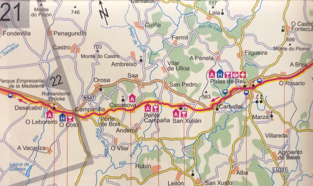 The last long walking day – 29 km up and down is huge. Penultimate walking day tomorrow then. How many stamps have you got on your Pilgrims Passport now? No doubt we’ll be told this weekend. Stay dry!