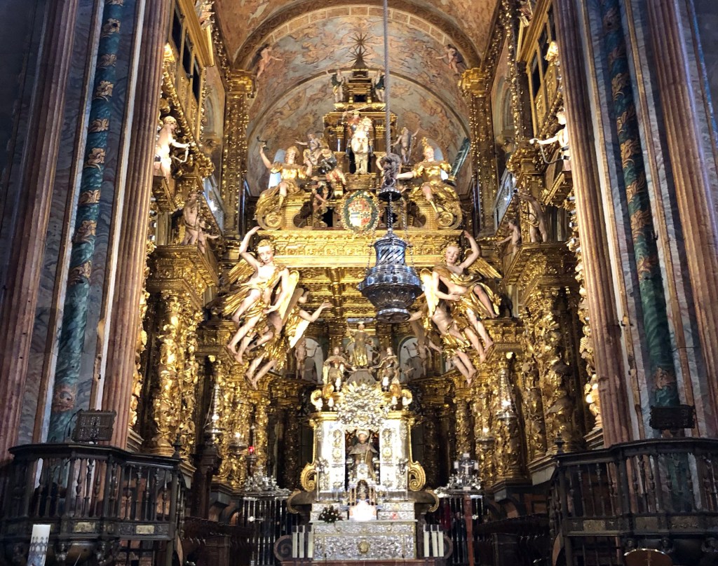 I thought this morning that my initial arrival in the Praza do Obradioro outside the Cathedral on Saturday afternoon, and our celebrations over a fine dinner last night with Rod, Werner and Michael, had sufficiently marked the completion of my walk and of reaching my destination. But it turns out that there was a missing piece all along – one that I had not envisaged as being crucial to my venture until it unfolded: the daily Pilgrims’ Mass at noon in the Cathedral. I missed the service on Saturday (when I arrived too late) and then again yesterday (when I was on my Finisterre tour), but I attended today, along with some hundreds of others, fellow pilgrims for the most part. My morning earlier had consisted of packing up, checking out, some souvenir shopping, and posting some items home (walking poles and pen-knife), ahead of a 10.00 am Cathedral tour. Having completed my anticipated visit of the building I decided to take a seat, just four rows from the front, and await the midday Mass. I was surprised that by 11.30 not just the seats, but the side aisles and transept also, were full, standing room only. Although the Mass was in Spanish and Latin, the complete silence of the congregation was remarkable, as the singing of the lone tenor and his organ accompaniment resounded around the ornate building. The air of timelessness had several folk near me in tears; I think that we were all in awe of the building and the rituals that linked us, in this place and in this moment, with the many past generations who had trodden the same Camino paths as us into Santiago across the centuries. As the finale of the Mass approached there were audible gasps from around me, as a team of eight men began hauling on the ropes that set the huge metal incense burner, the thurible, swinging above our heads, a fog of incense in its wake. The handshakes offered in The Peace that followed, were soon abandoned in favour of hugs and tears by those around me. An awesome experience it was indeed, drawn no doubt from emotion and elation, plus a little fatigue, in a moment that will remain with me, as my Camino finally drew to its conclusion.